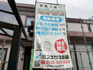 外壁・南面側・玄関廻り、架設足場組み上げ作業:組み上げと看板シートの取り付けを行いました。