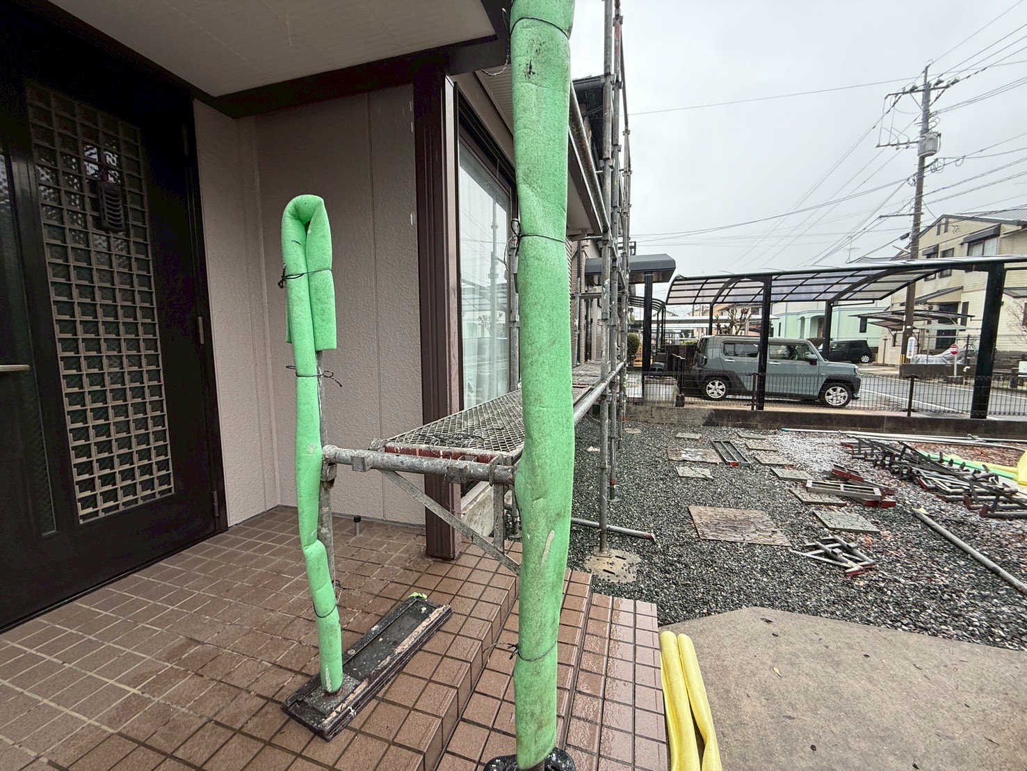 外壁・南面側・玄関廻り、架設足場組み上げ作業です。