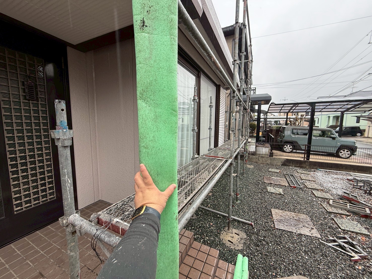 外壁・南面側・玄関廻り、架設足場組み上げ作業:保護カバーの取り付けです。