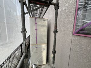 外壁・1F、給湯器(ボイラー)・養生貼りの施工です。