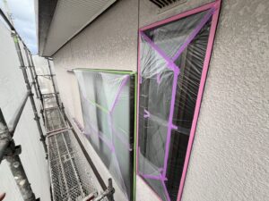 外壁・2F窓廻りと縦窓・養生貼りの施工です。