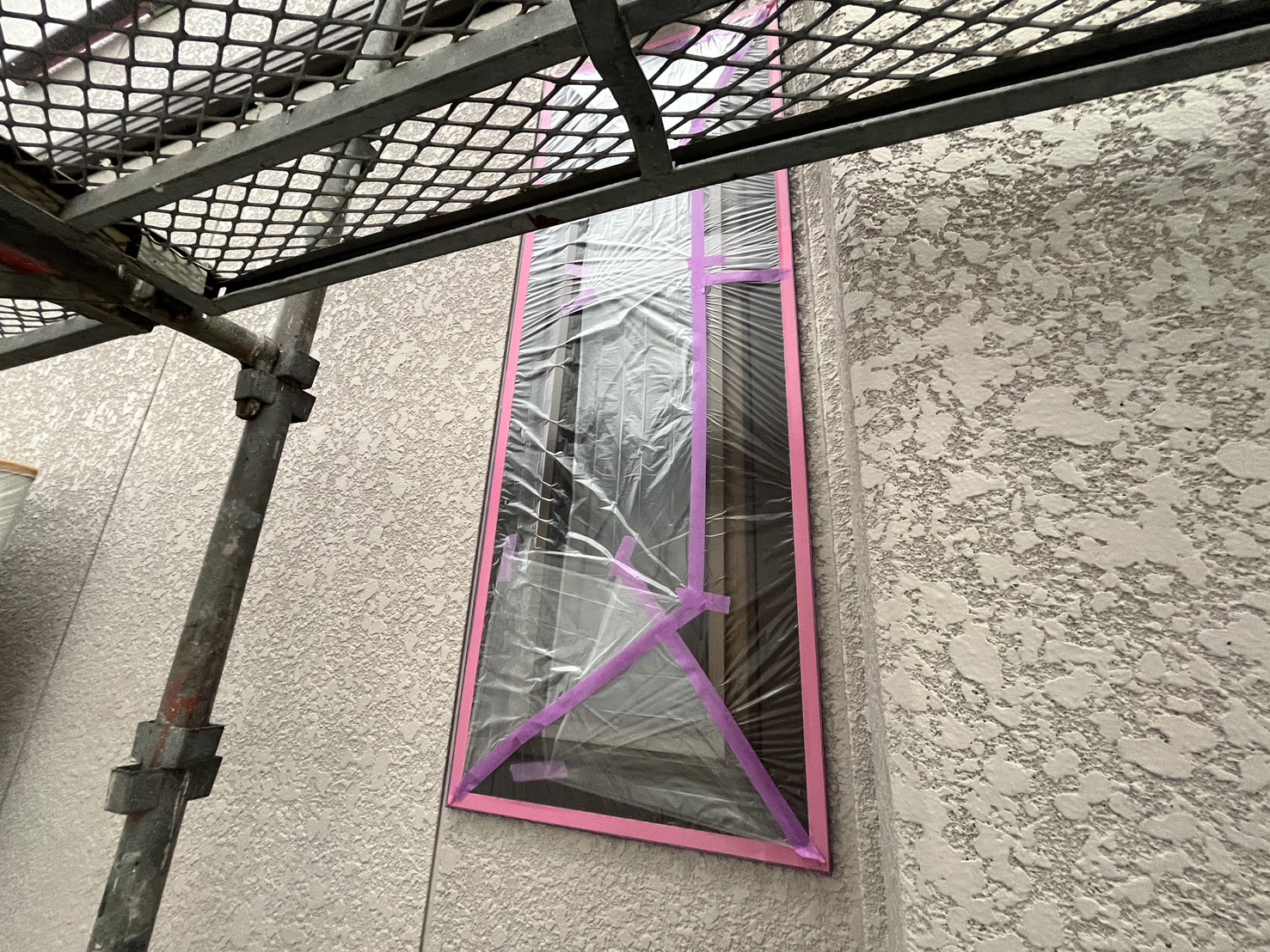 外壁・2F窓廻りと縦窓・養生貼りの施工です。