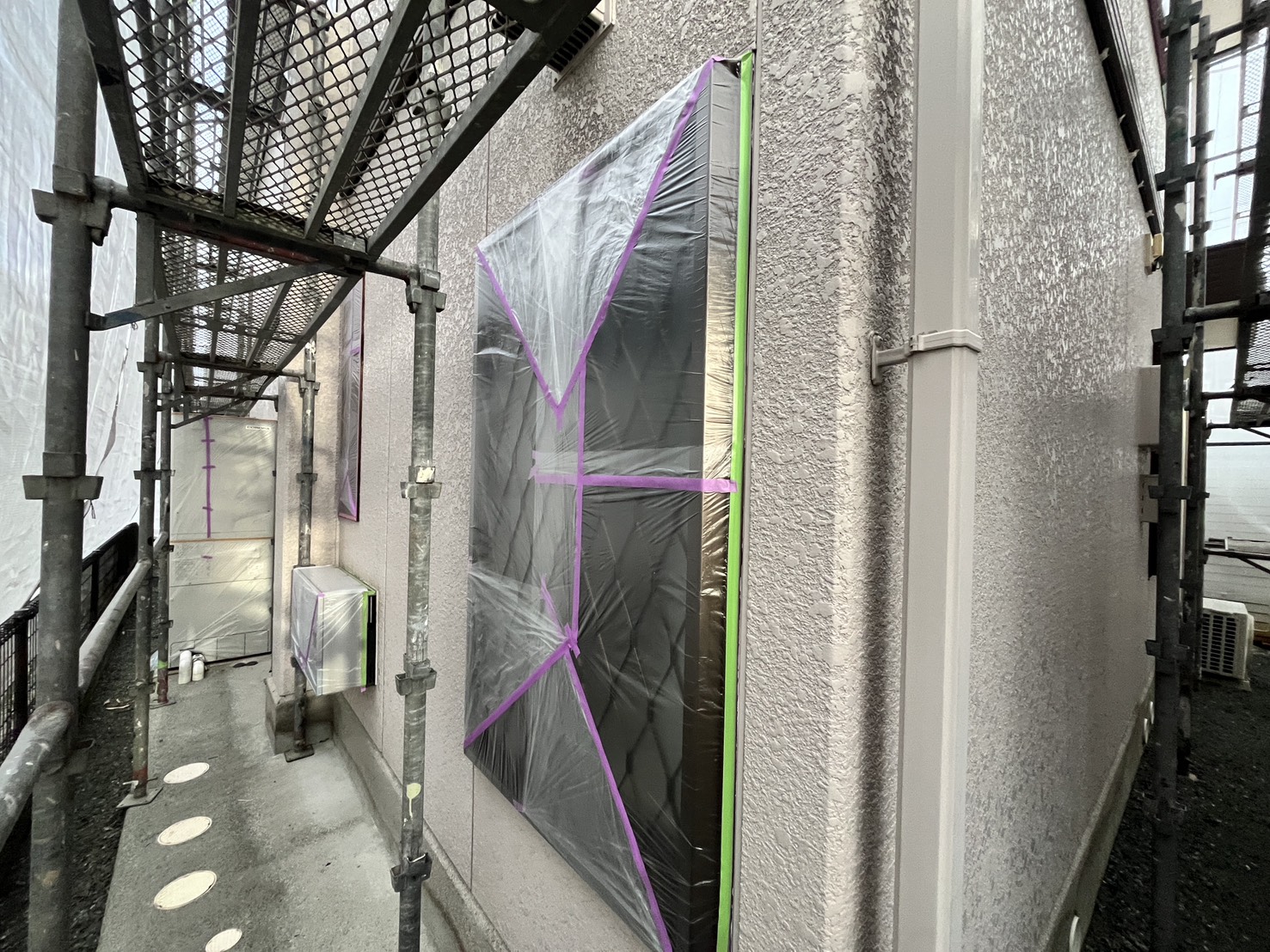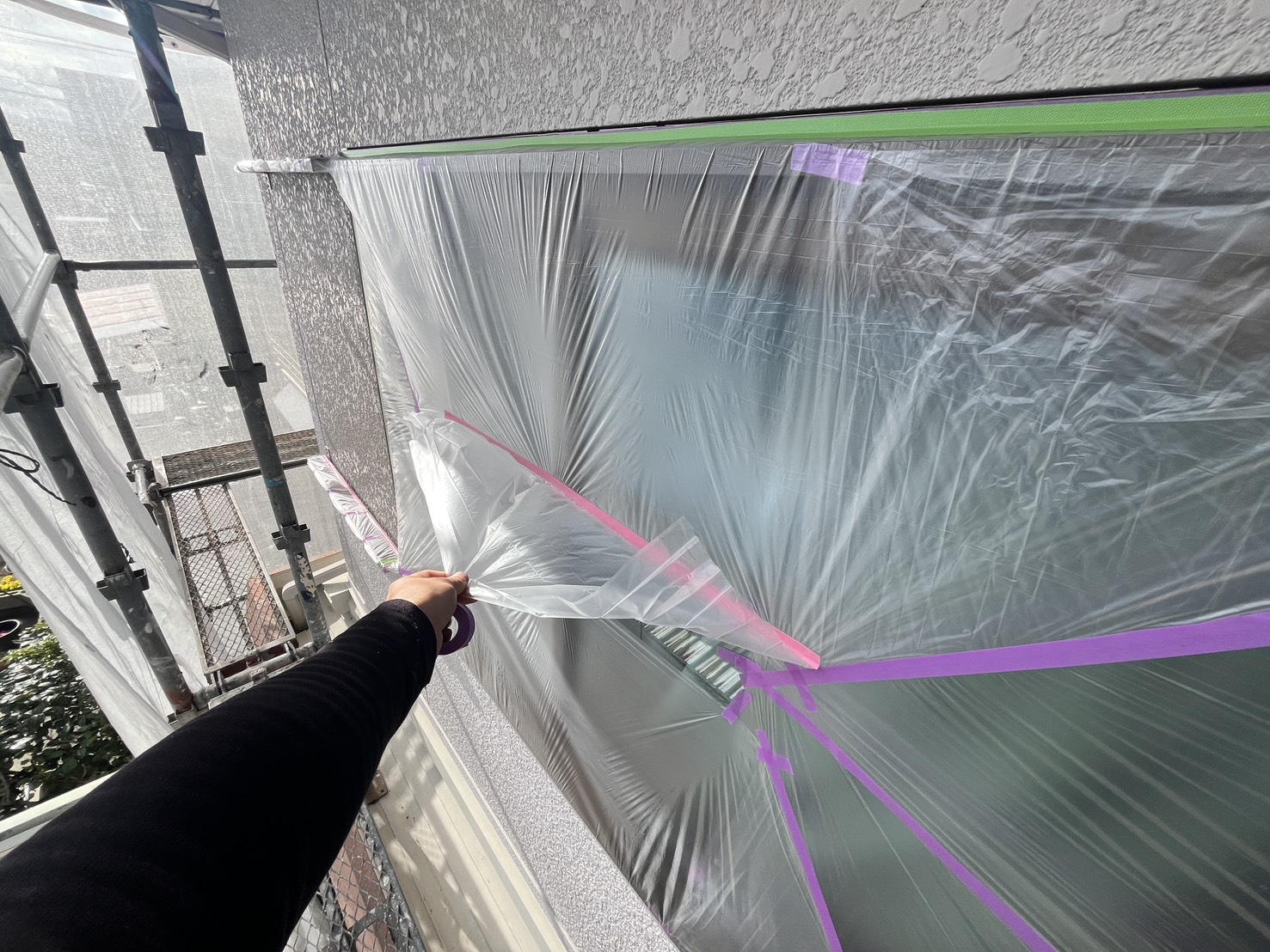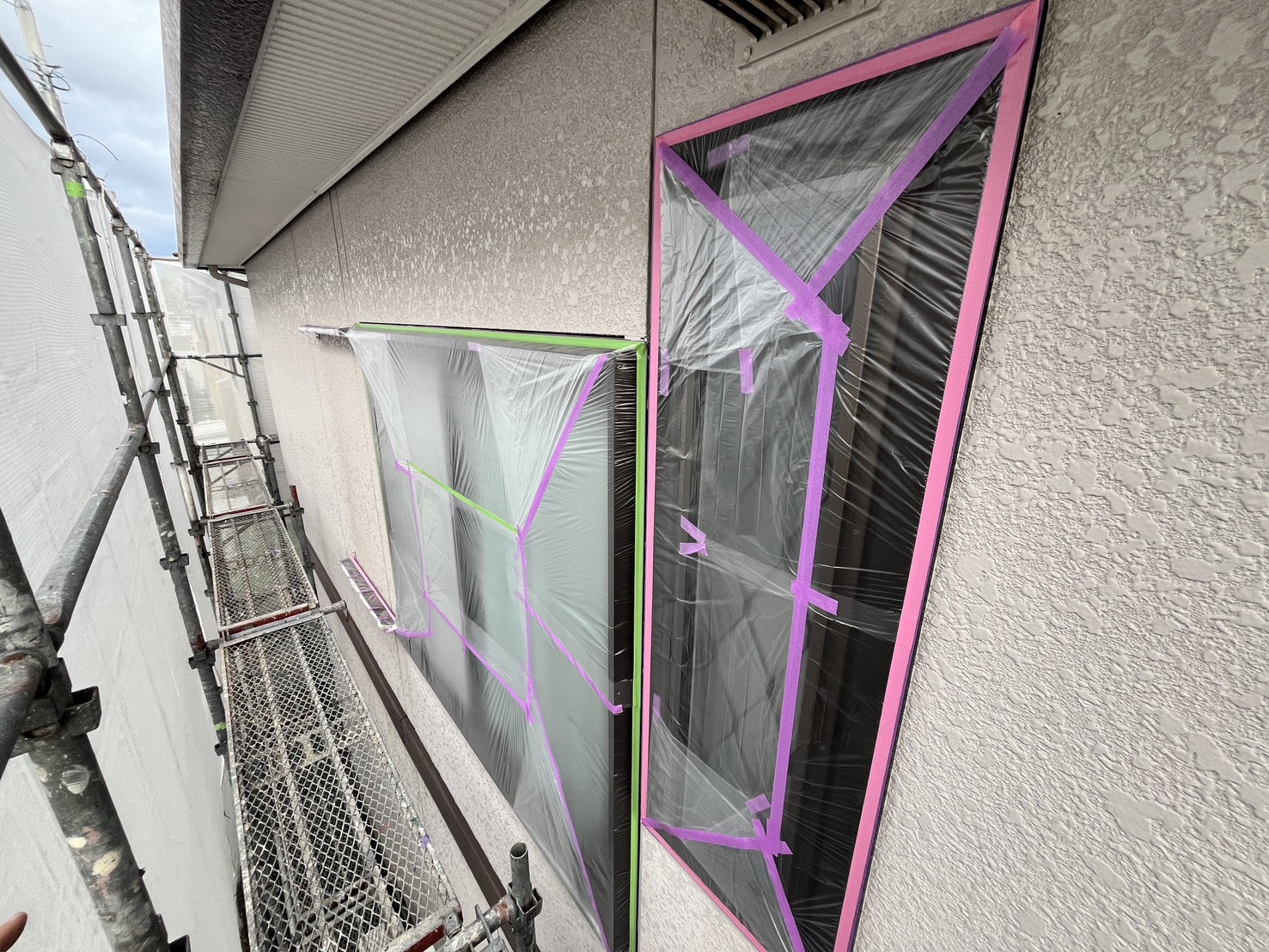 外壁・1F水回り窓廻り・養生貼りの施工です。
