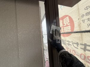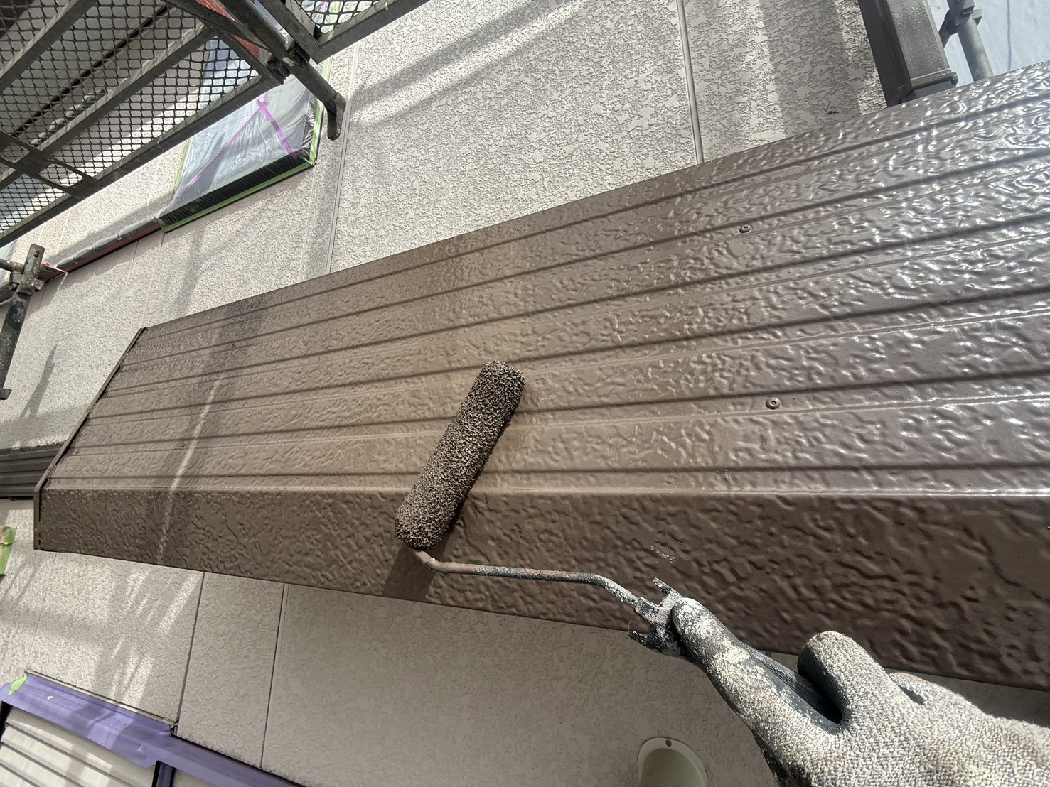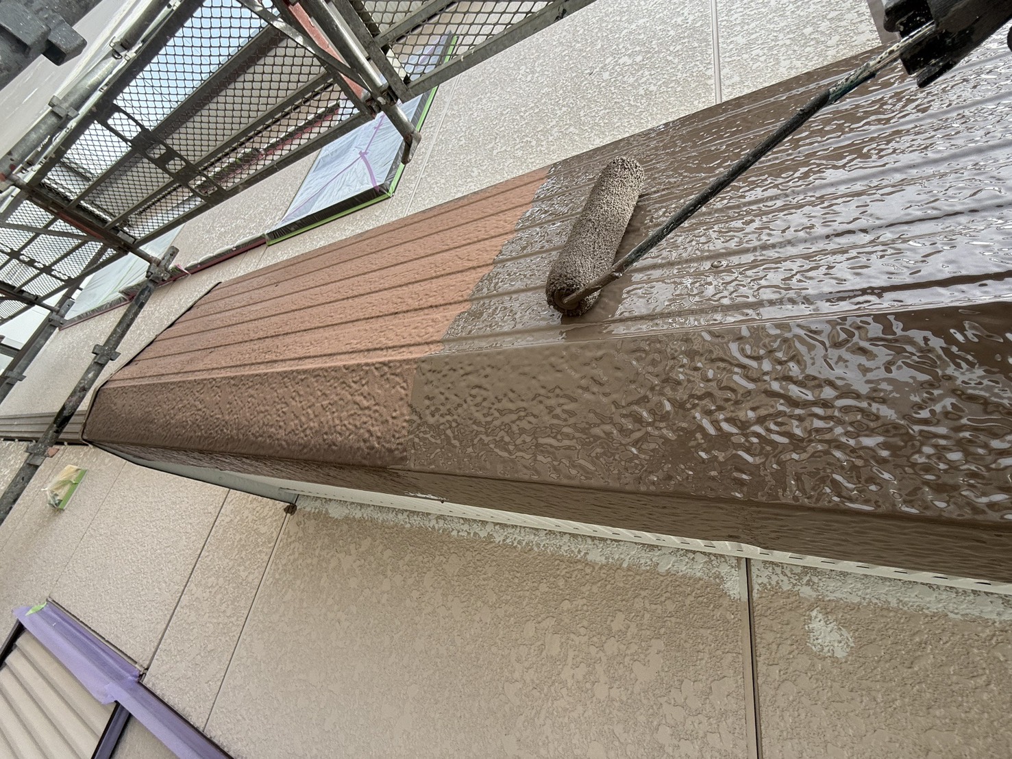 外壁・小庇上部・中塗り:KF無機4フッ化フッ素樹脂SC-34ノースブラウンのローラー塗り施工です。
