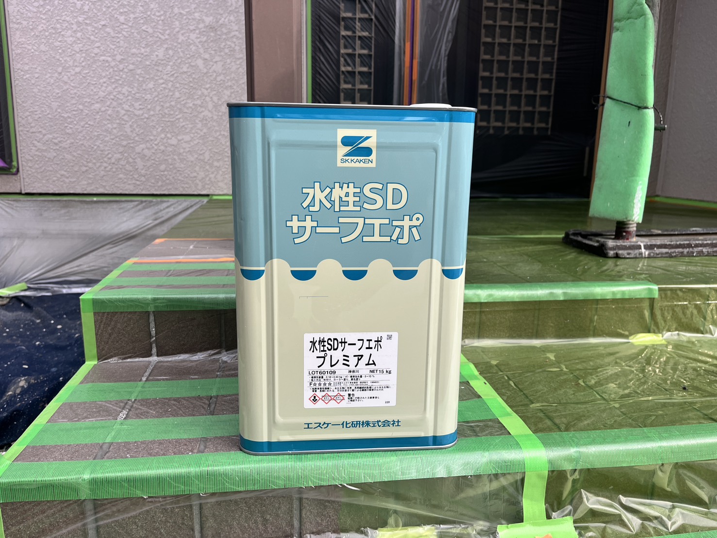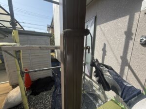 外壁・玄関縦柱・下塗り:KF無機4フッ化フッ素樹脂SC-34ノースブラウンのローラー塗り施工前です。