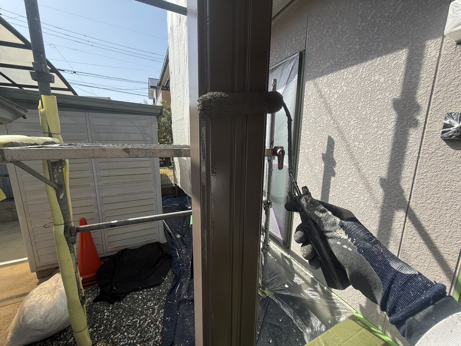 外壁・玄関縦柱・下塗り:KF無機4フッ化フッ素樹脂SC-34ノースブラウンのローラー塗り施工です。