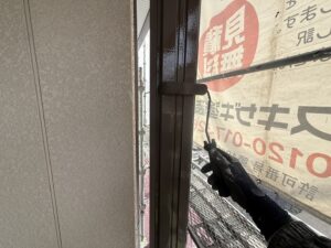 外壁・帯部・下塗り:KF無機4フッ化フッ素樹脂SC-34ノースブラウンのローラー塗り施工です。
