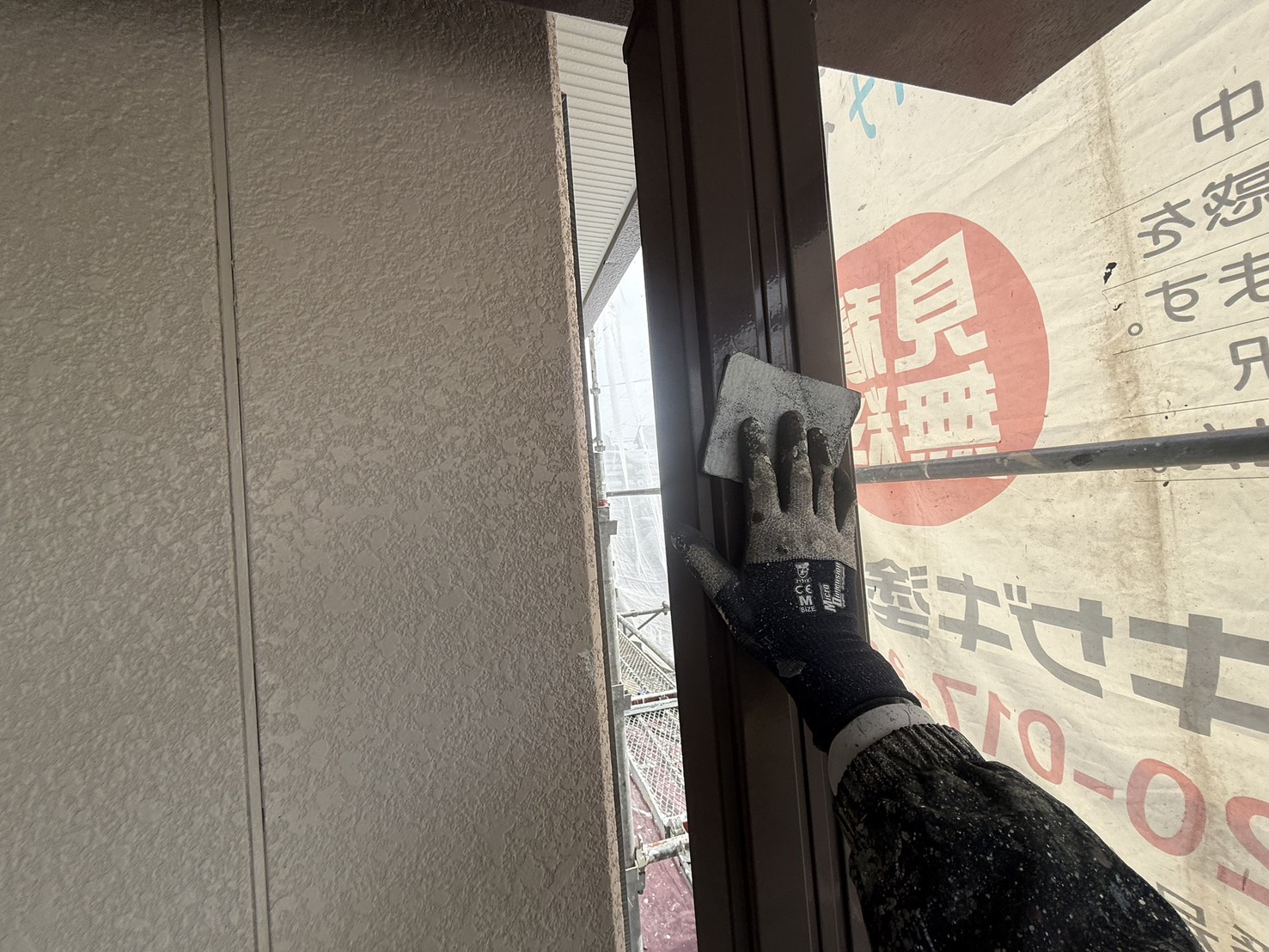 外壁・帯部・中塗り:KF無機4フッ化フッ素樹脂SC-34ノースブラウンのローラー塗り施工です。