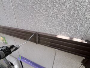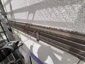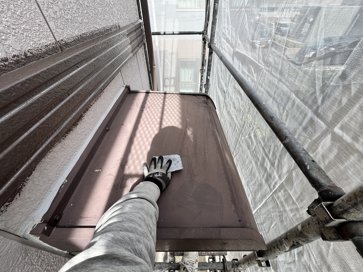 外壁・小庇上部・下塗り:KF無機4フッ化フッ素樹脂SC-34ノースブラウンのローラー塗り施工前(ケレン処理)です。