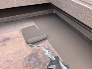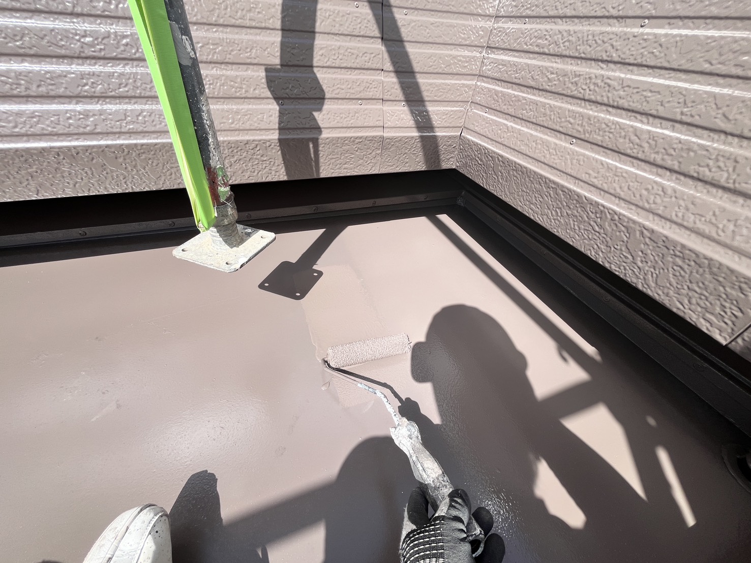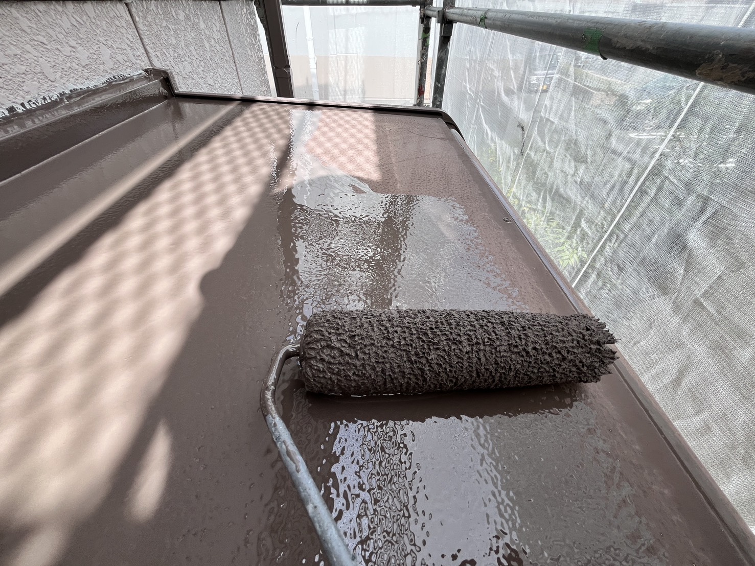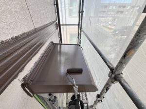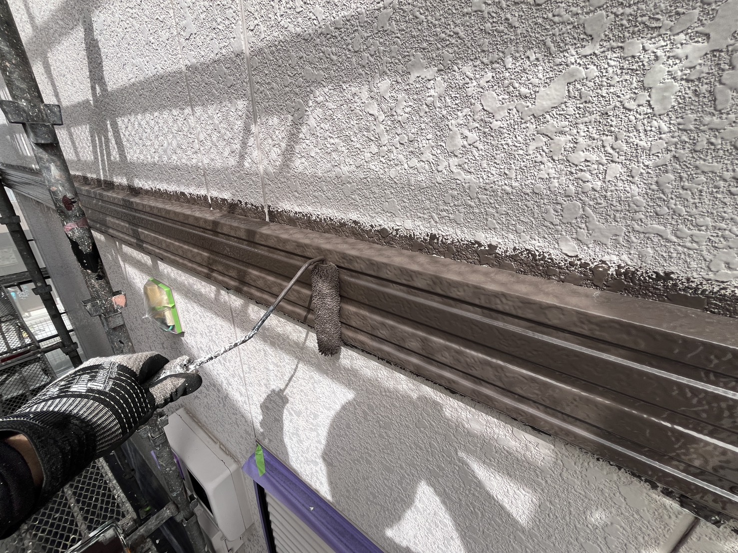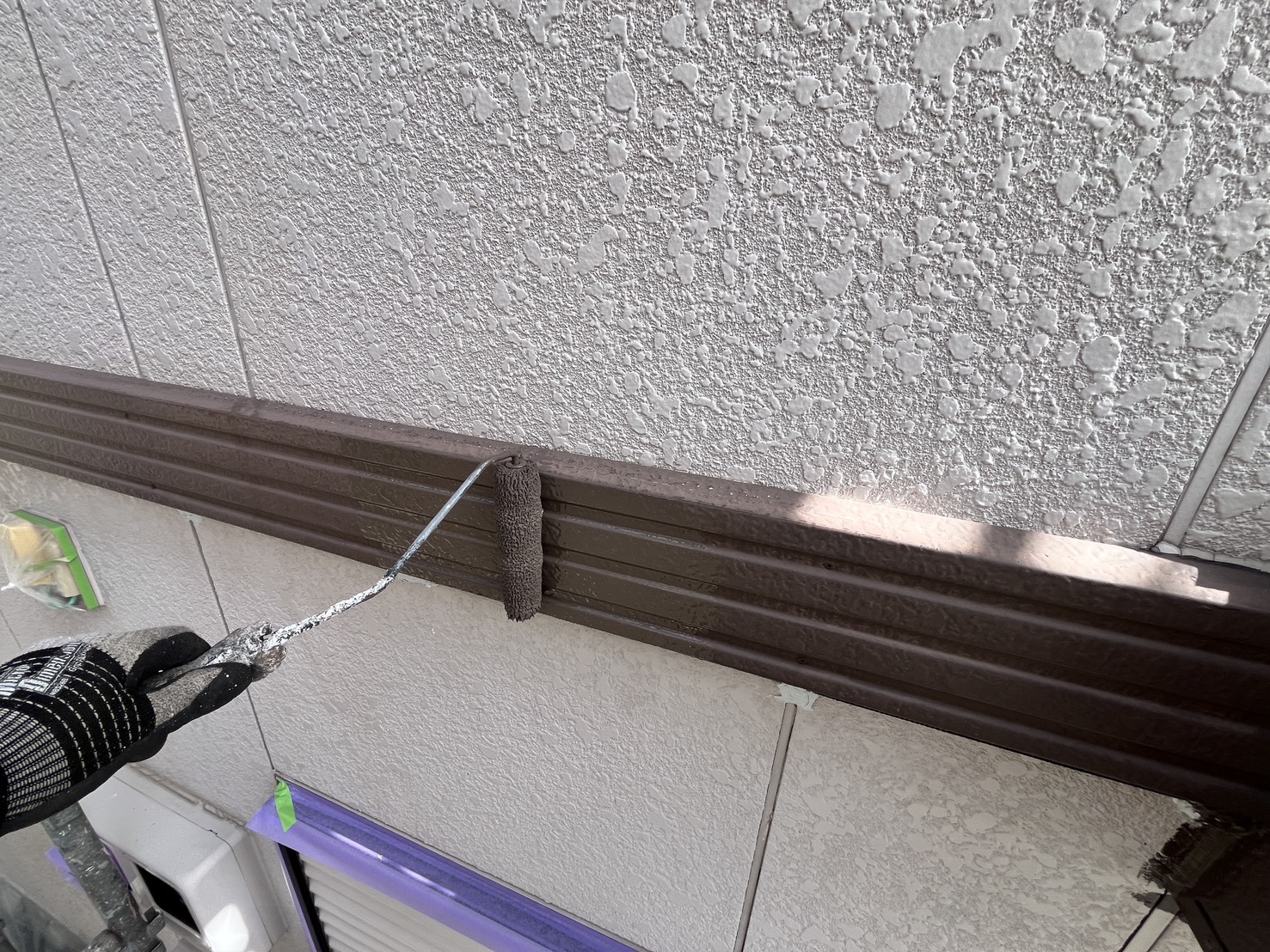 外壁・小庇上部・下塗り:KF無機4フッ化フッ素樹脂SC-34ノースブラウンのローラー塗り施工です。