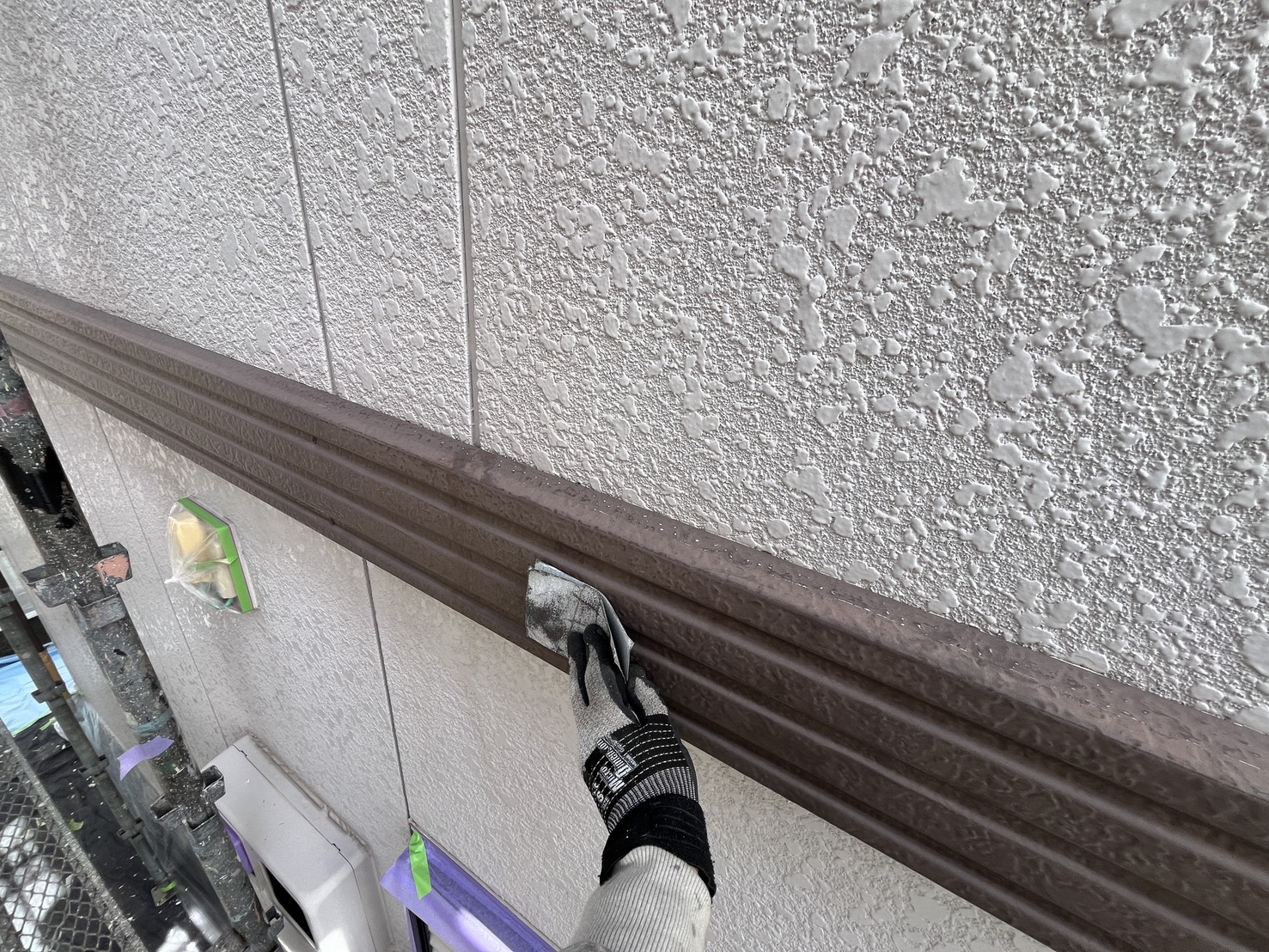 外壁・帯部・下塗り:KF無機4フッ化フッ素樹脂SC-34ノースブラウンのローラー塗り施工前(ペーパー処理)です。