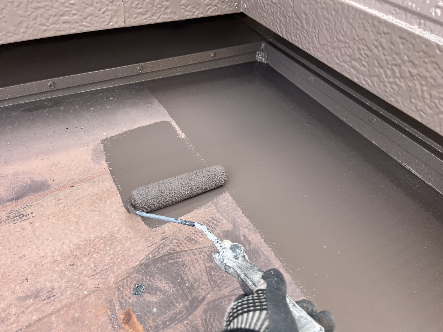 外壁・パラペット部・下塗り:KF無機4フッ化フッ素樹脂SC-34ノースブラウンのローラー塗り施工です。