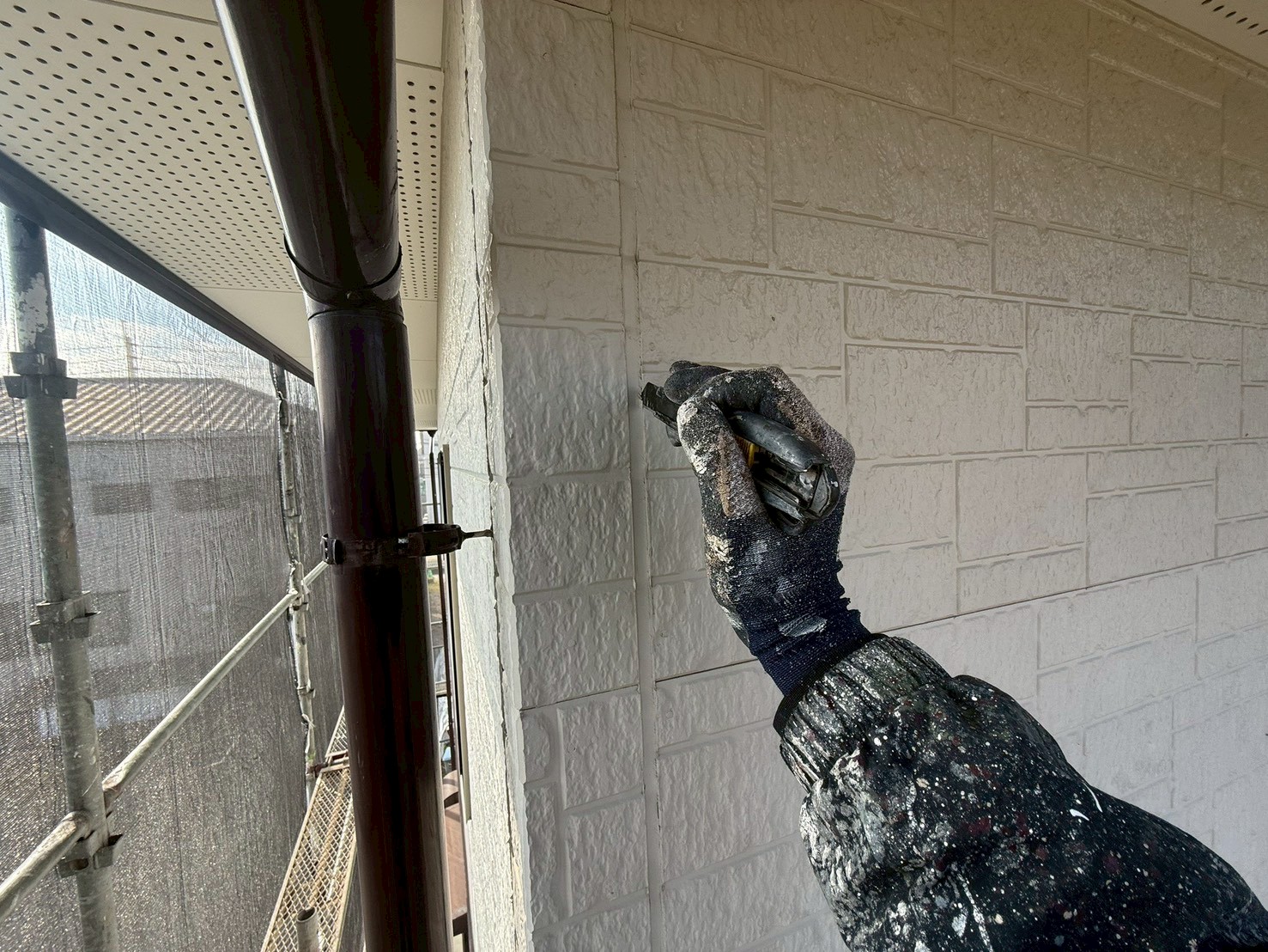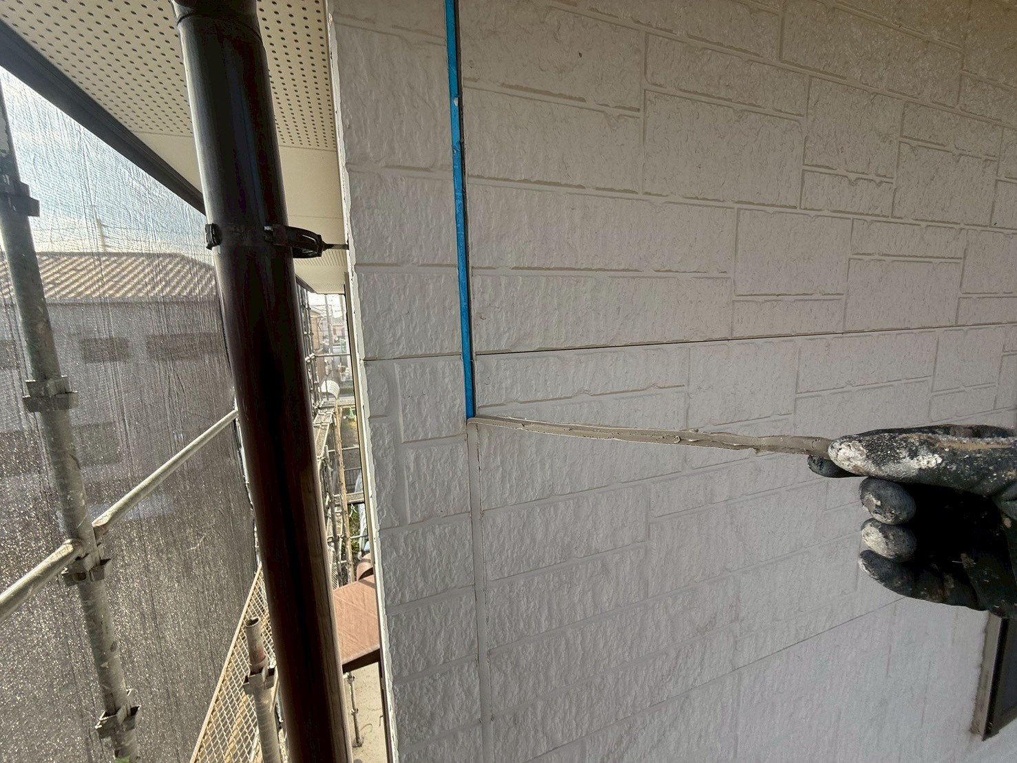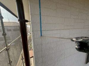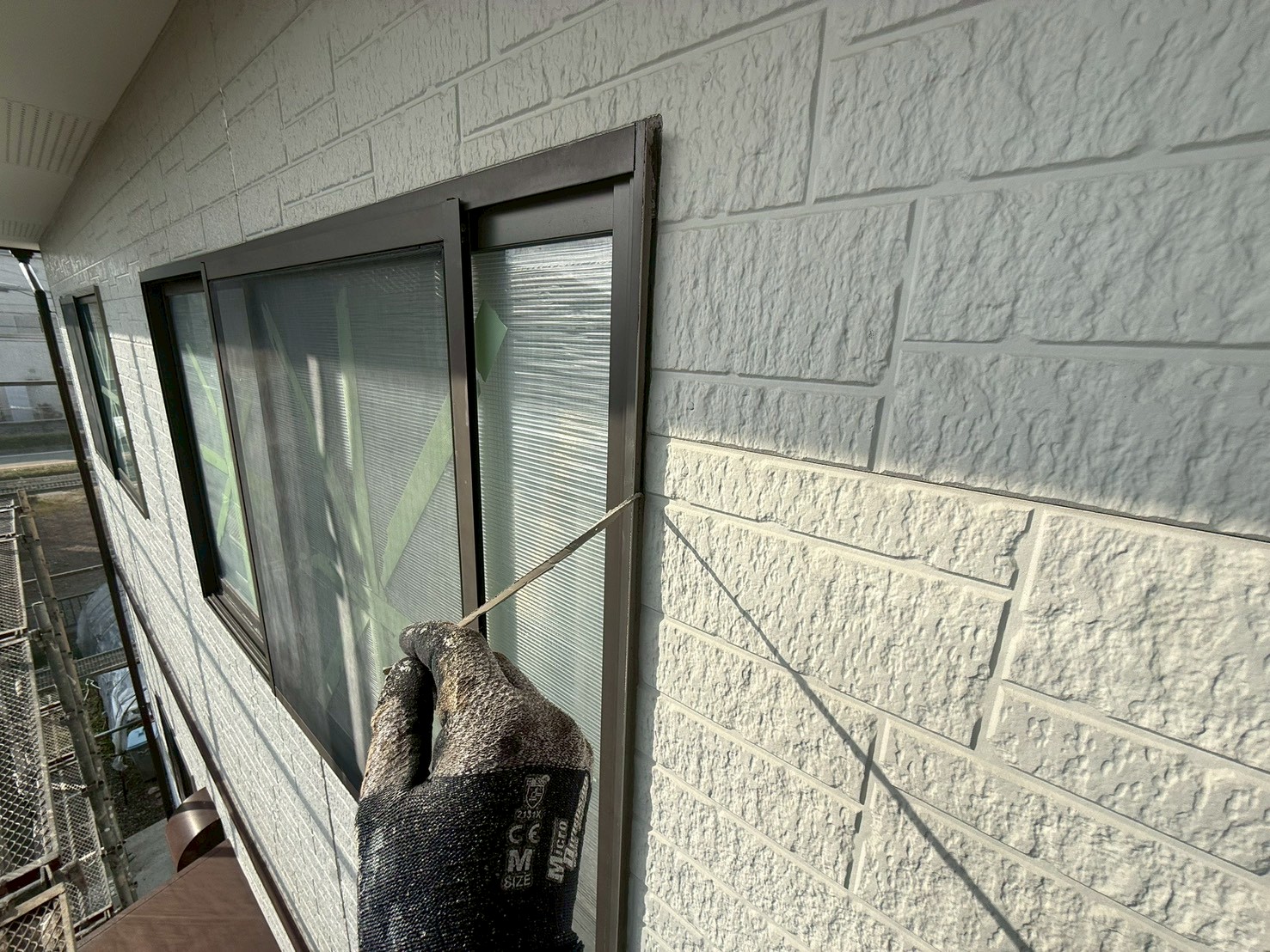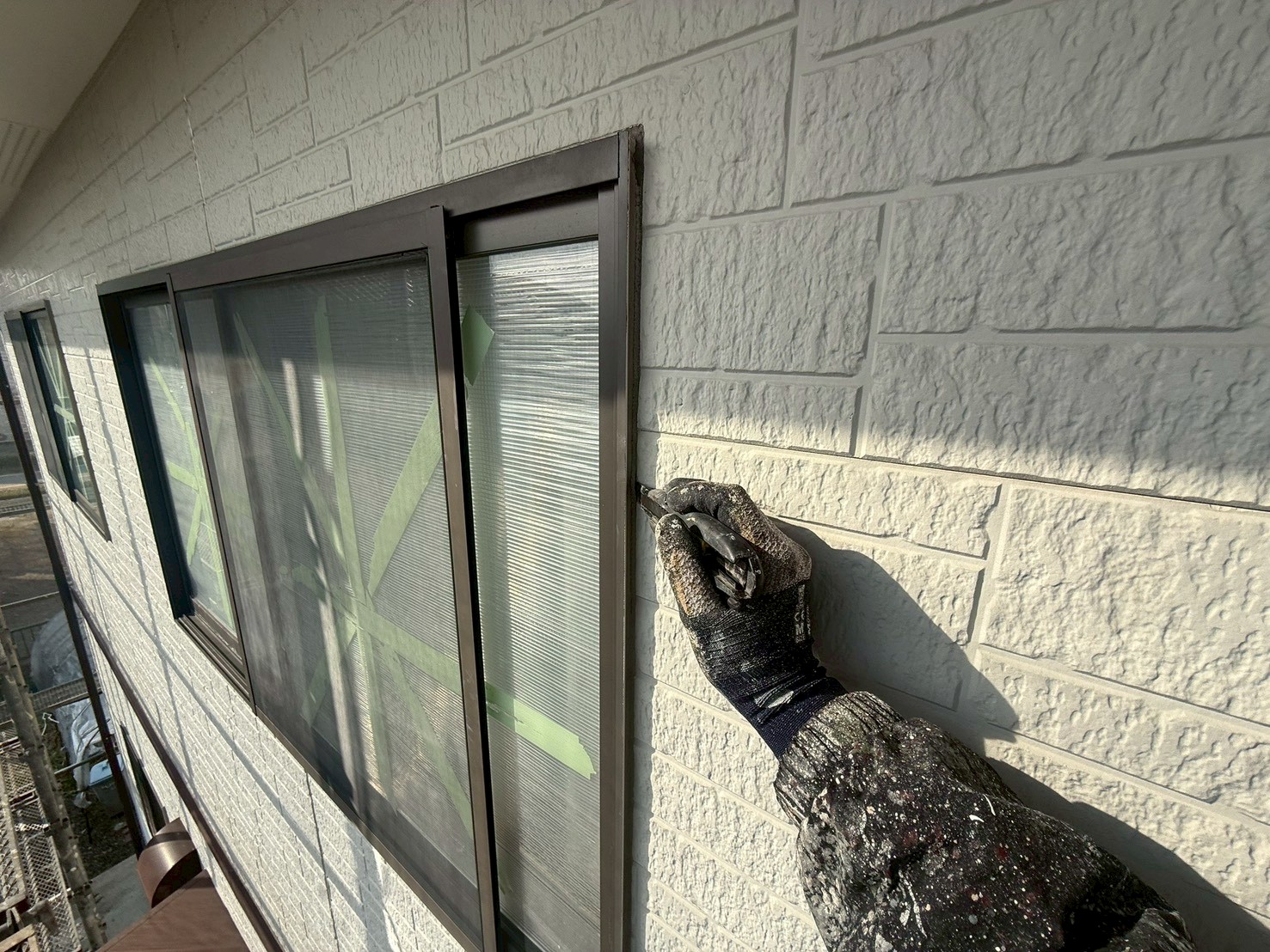 本日の作業は、外壁・旧コーキング材撤去とコーキング専用テープ貼りの施工です。