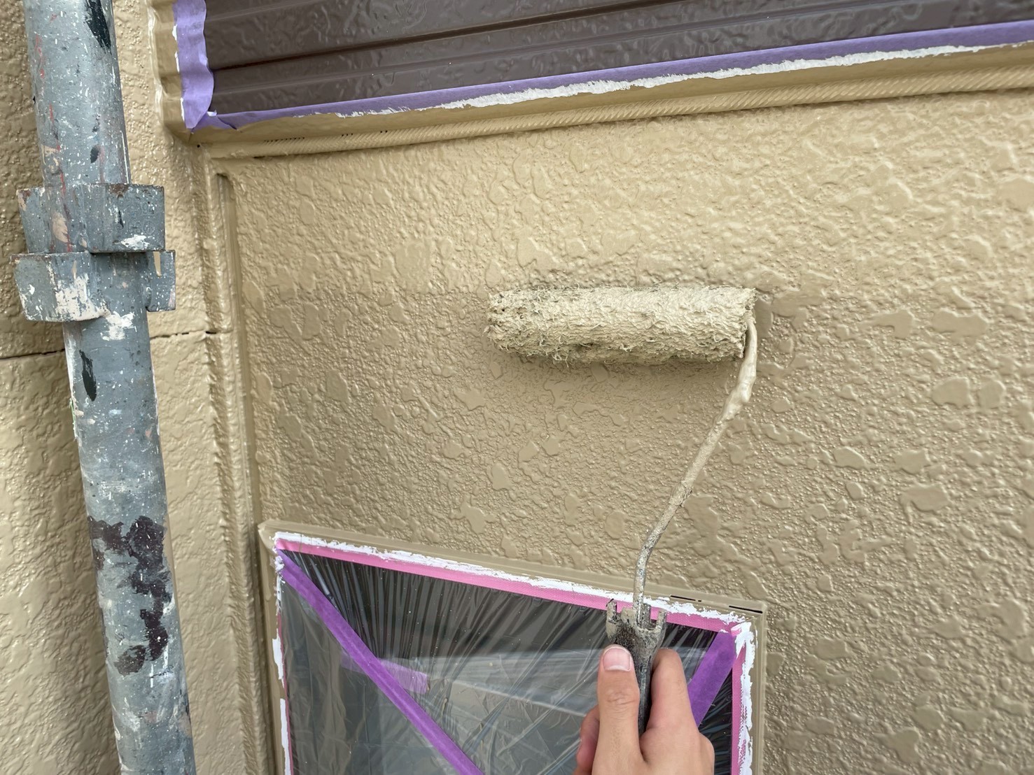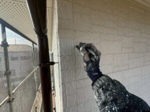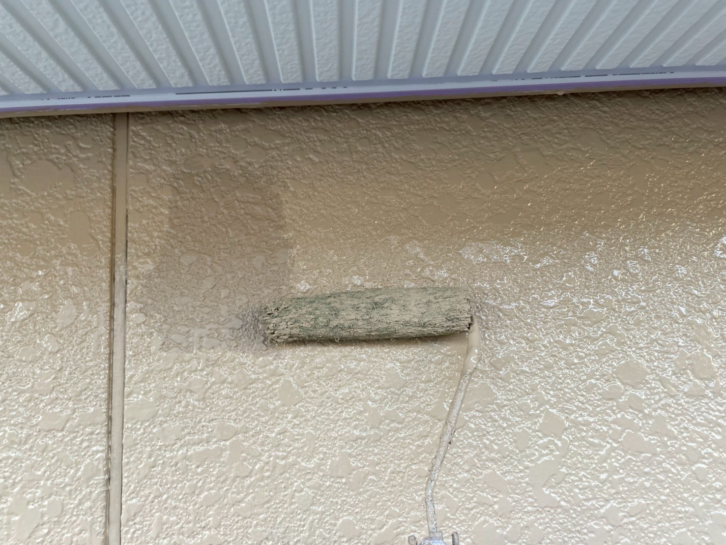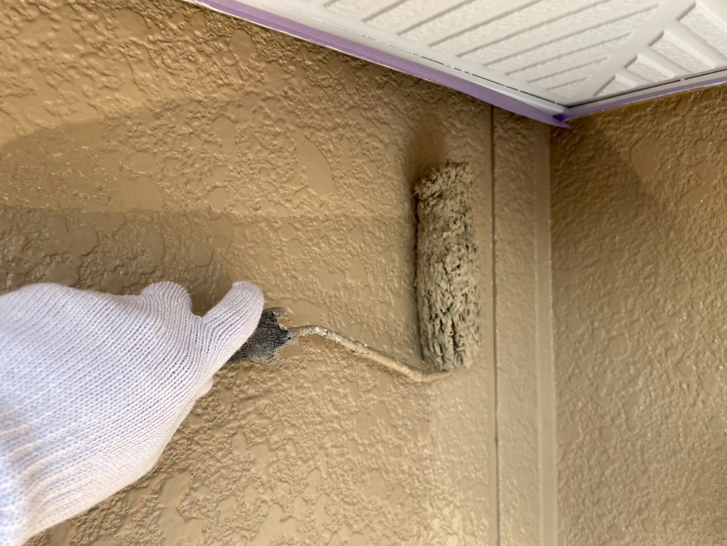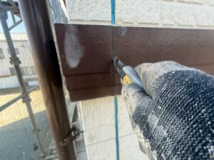 外壁・1F軒際廻り・上塗り仕上げ:KF無機4フッ化フッ素樹脂SC-22ローラー塗り施工です。
