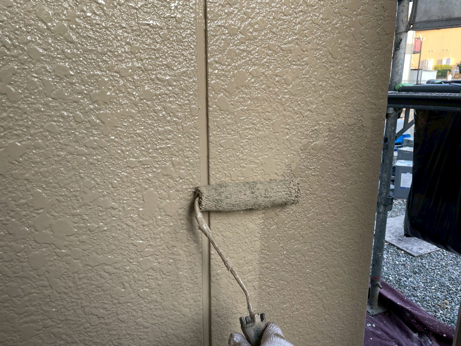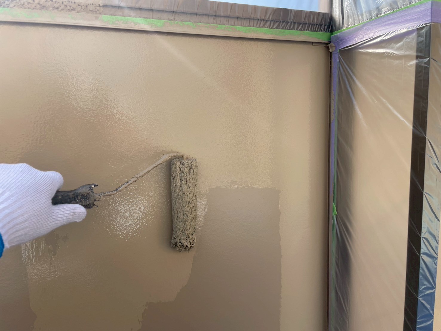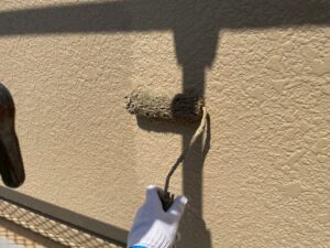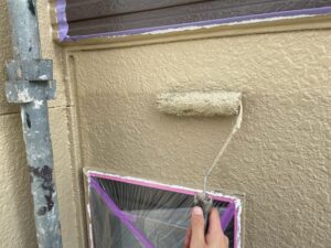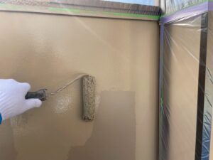 外壁・1F玄関廻り・上塗り仕上げ:KF無機4フッ化フッ素樹脂SC-22ローラー塗り施工です。
