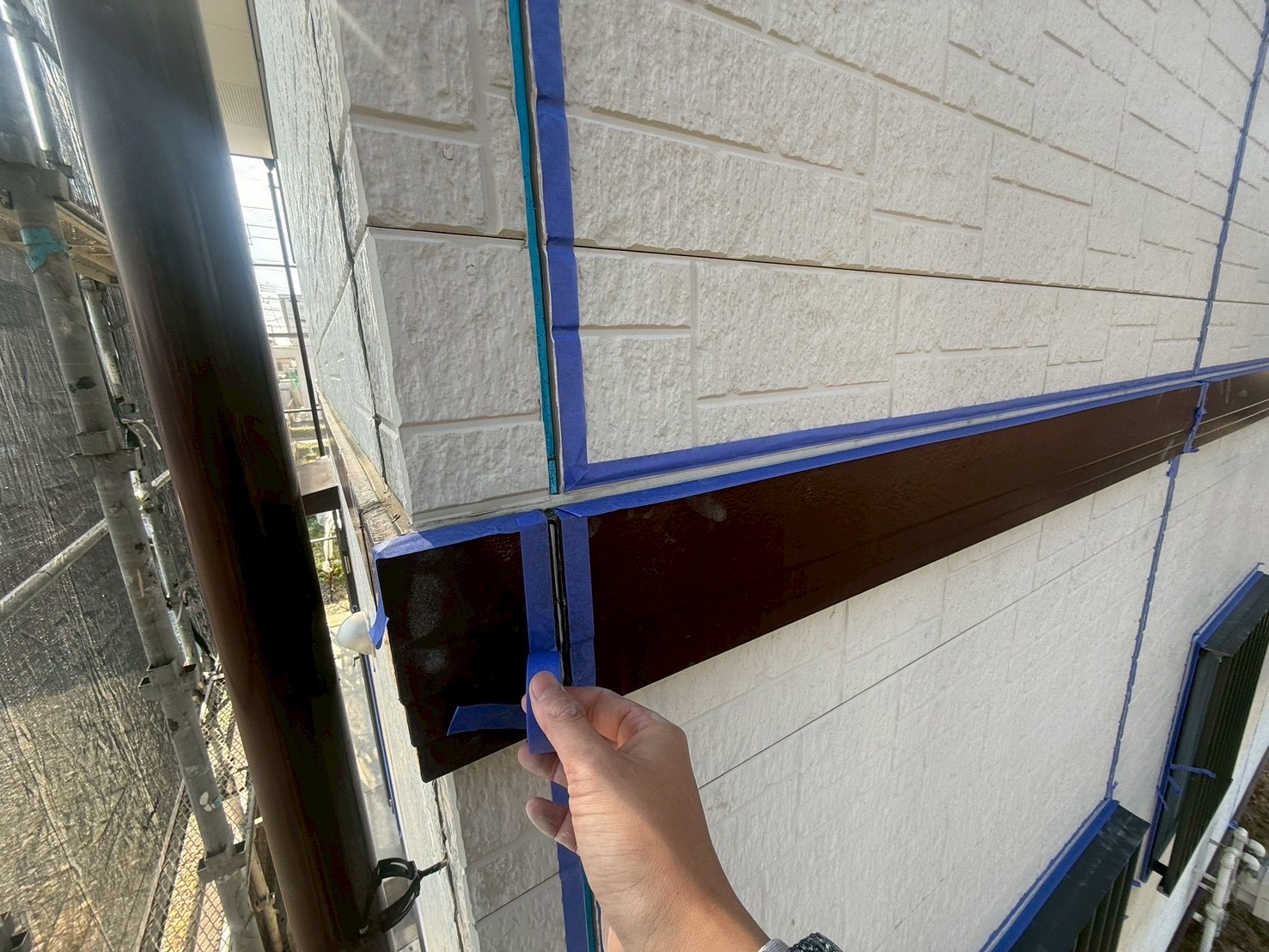 外壁・帯部目地・コーキング専用テープ貼りの施工です。