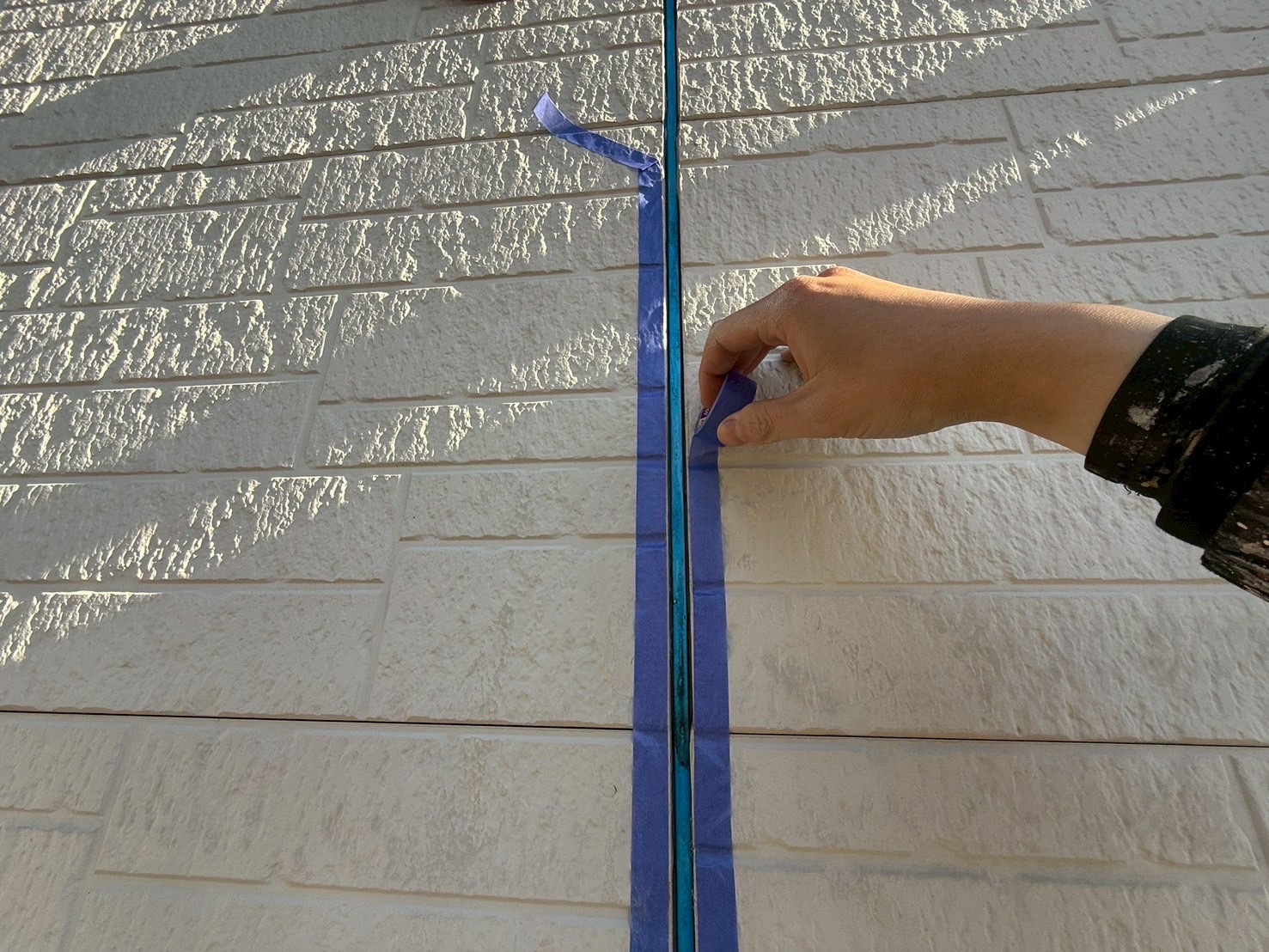 外壁・縦目地・コーキング専用テープ貼りの施工です。