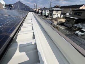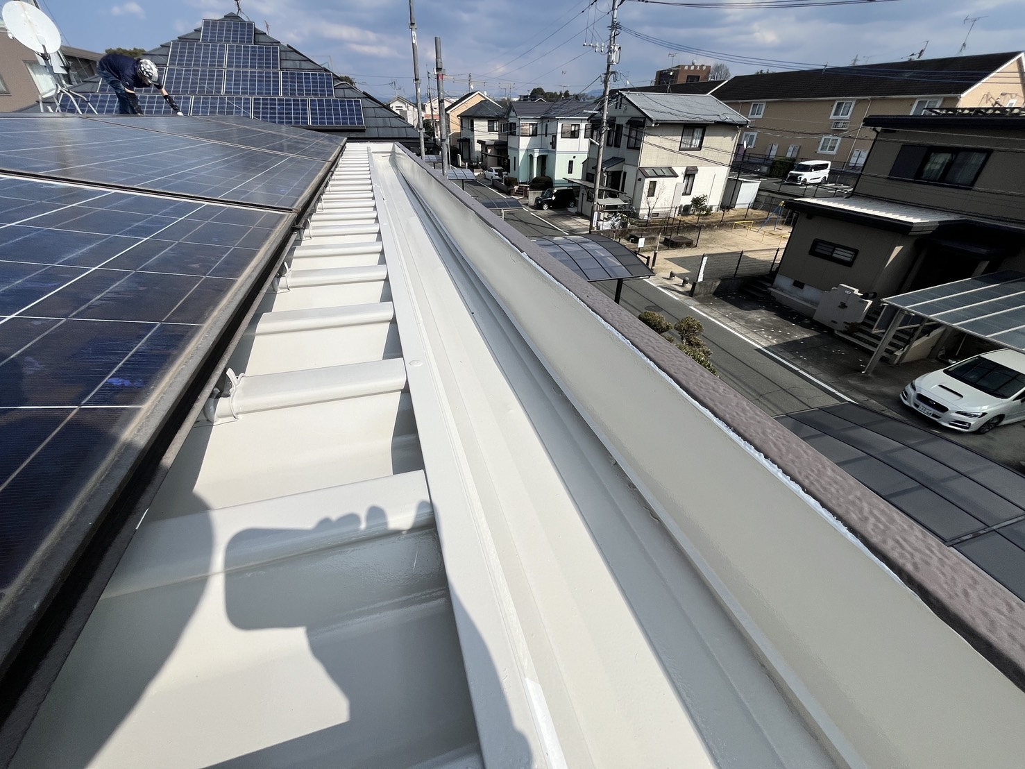 屋根・2F排水溝廻り・中塗り:KF無機4フッ化フッ素樹脂のローラー塗り施工です。