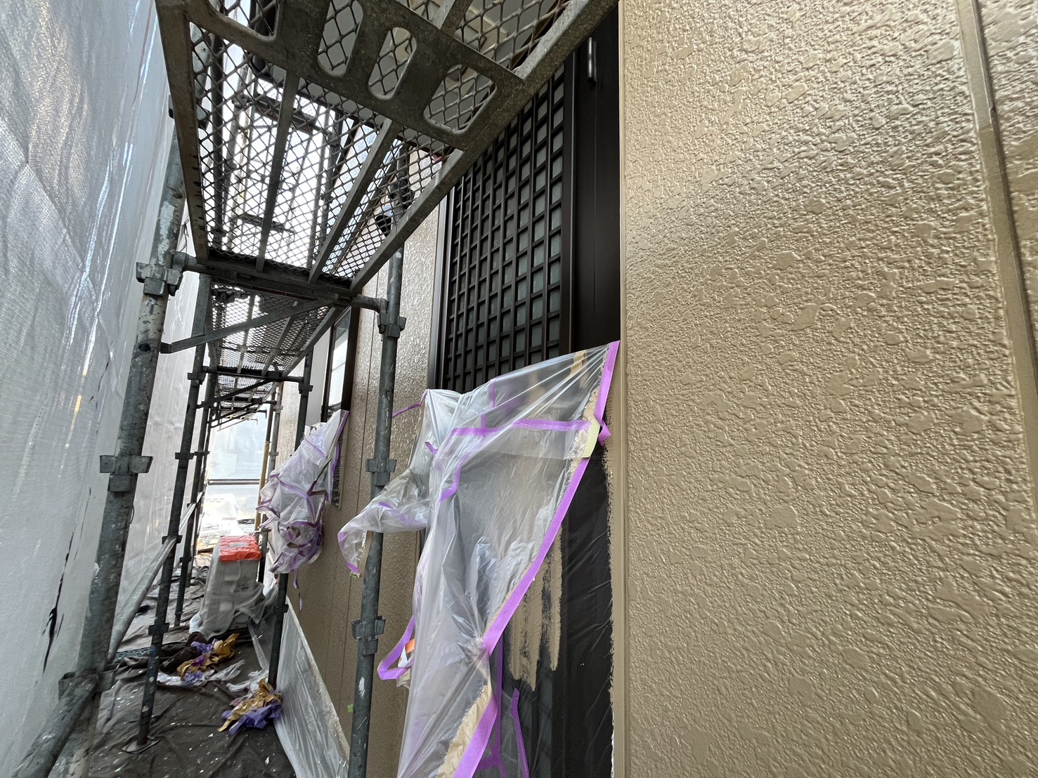 外壁・1F廻り・上塗り仕上げ後、養生の撤去作業です。