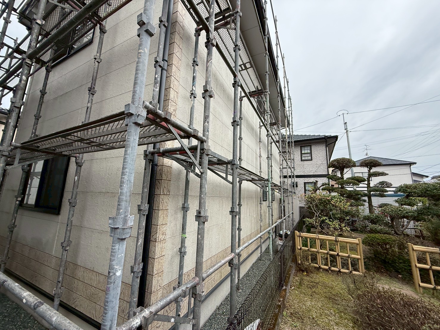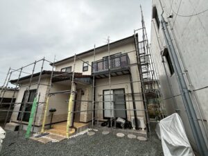 外壁・屋根・架設足場組み上げと飛散防止ネット取り付けの施工:全面の組み上げ後です。