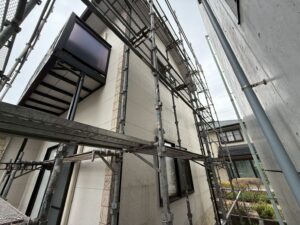 外壁・屋根・架設足場組み上げと飛散防止ネット取り付けの施工:西面側の組み上げ後です。