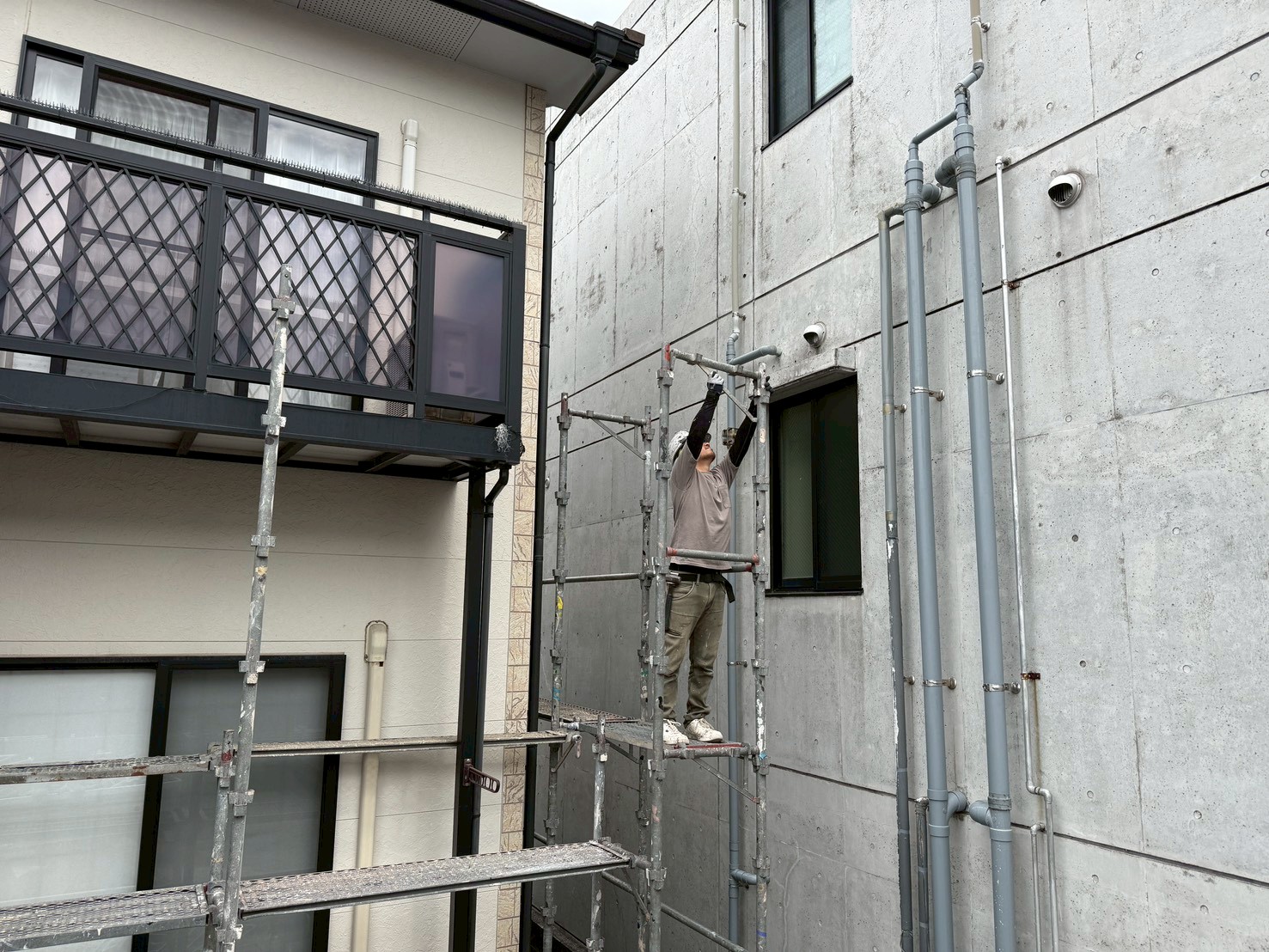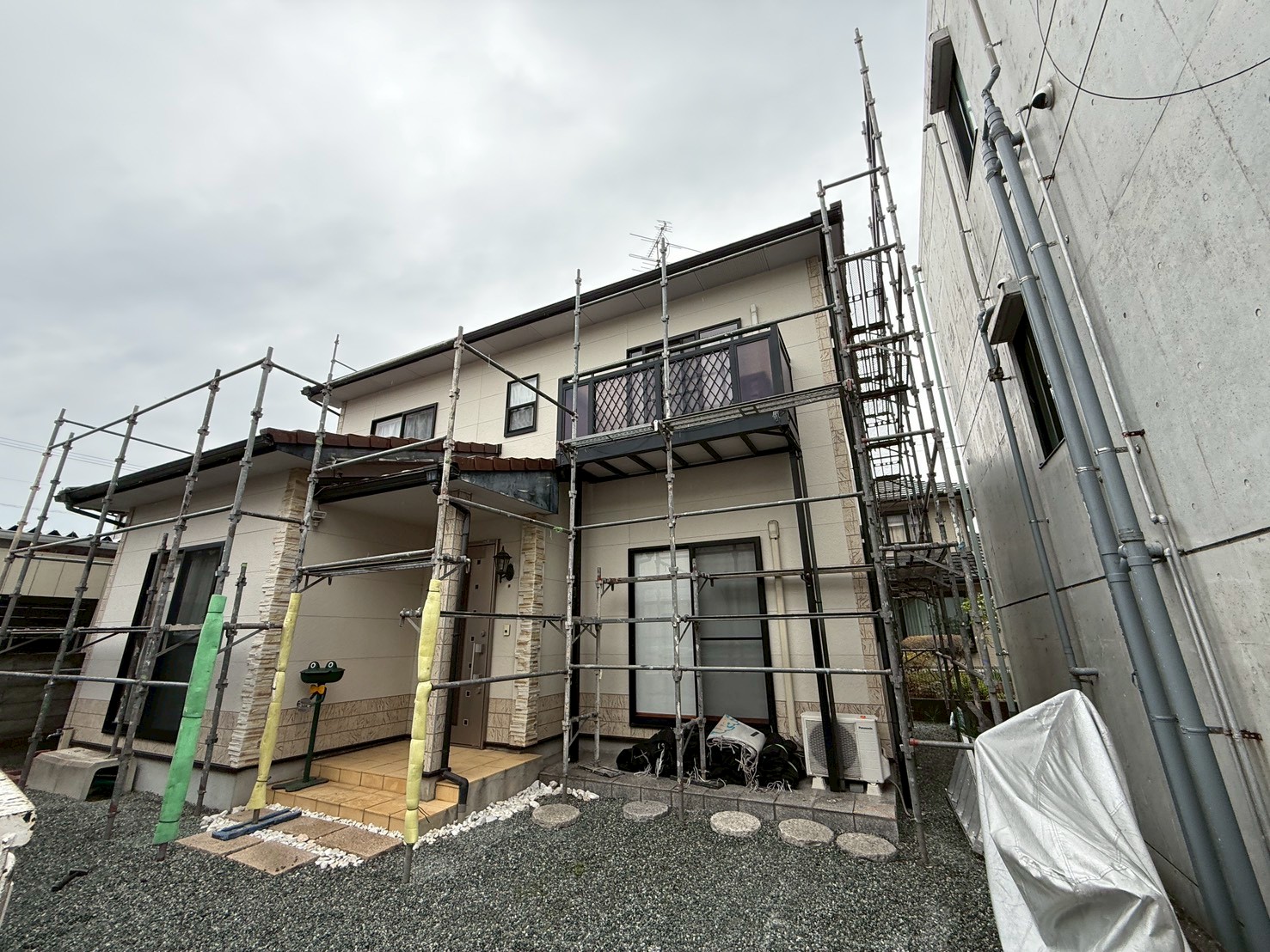 外壁・屋根:架設足場組み上げと飛散防止ネット取り付けの施工です。