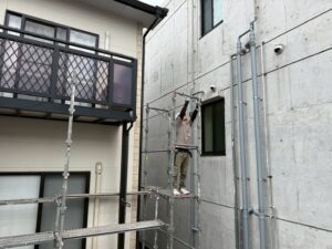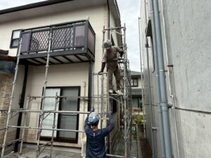 外壁・屋根・架設足場組み上げと飛散防止ネット取り付けの施工:西面側の組み上げです。