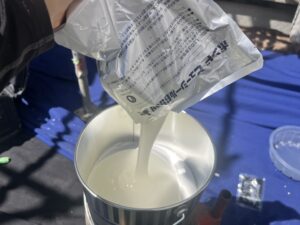 外壁・業務用コーキング材開封後、2液基剤の投入です。