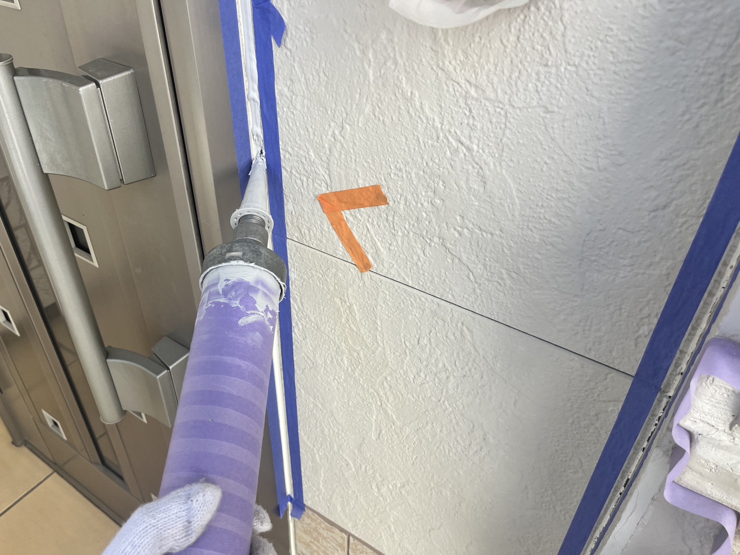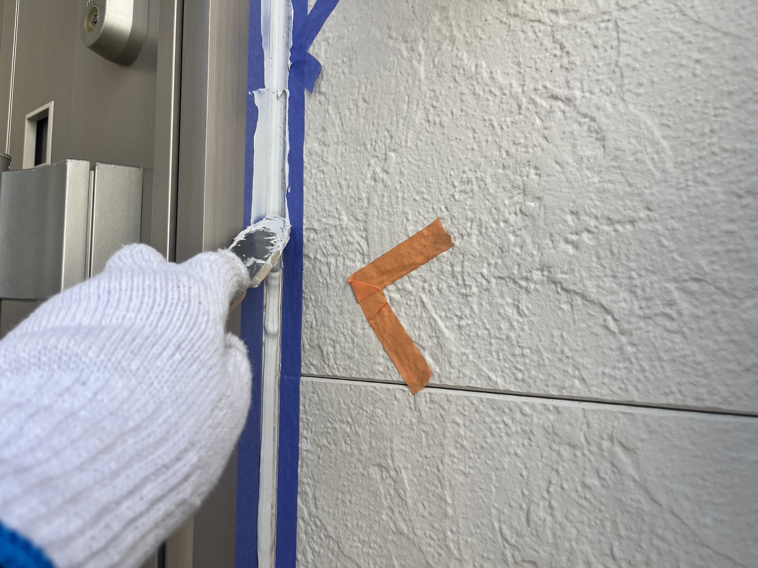 外壁・玄関ドア廻り・専用プライマー(接着剤)の施工後、業務用コーキング材の注入です。