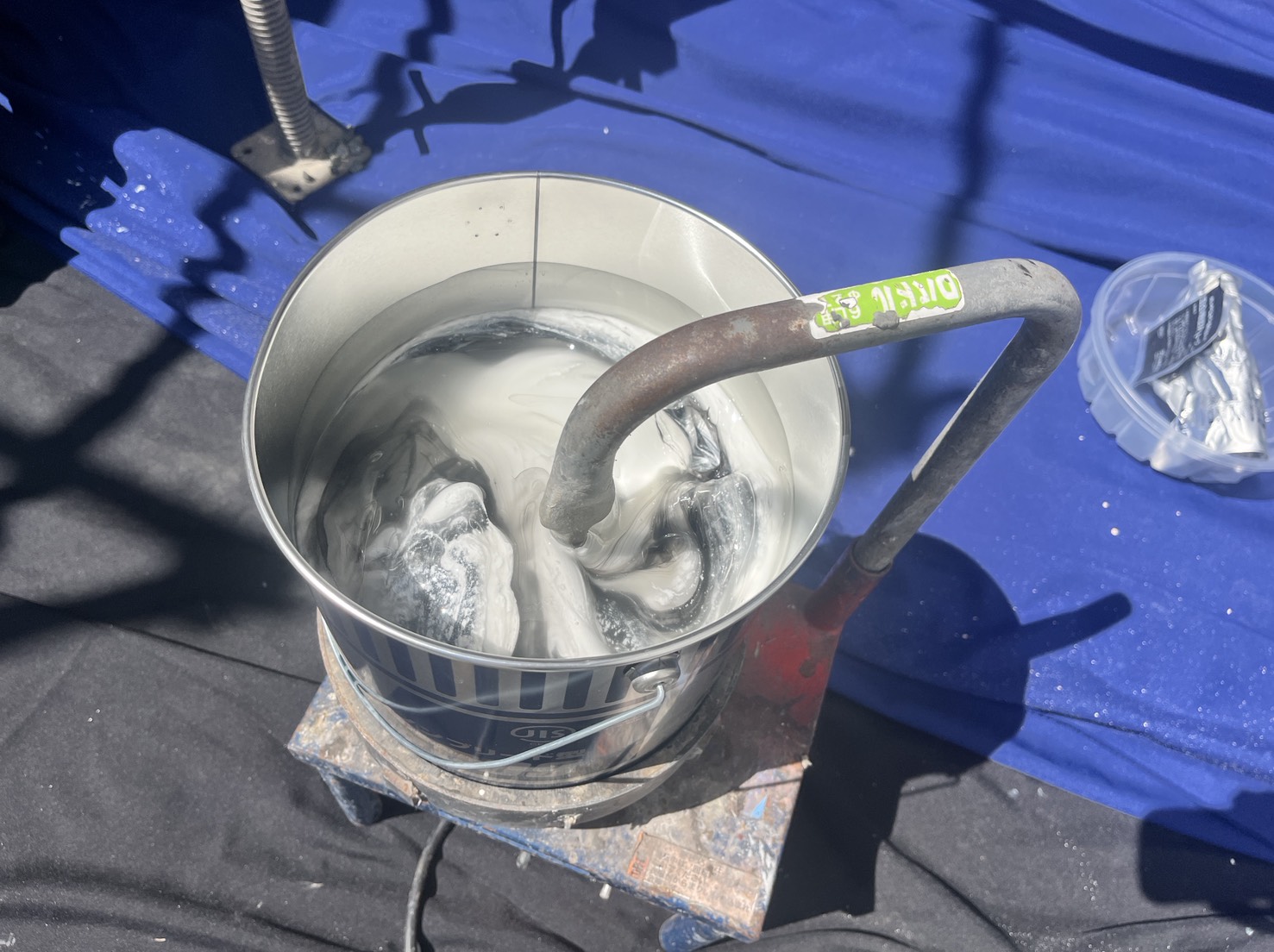 外壁・業務用コーキング材開封後、2液基剤とトナーの投入後、しっかり撹拌機で撹拌を行います。