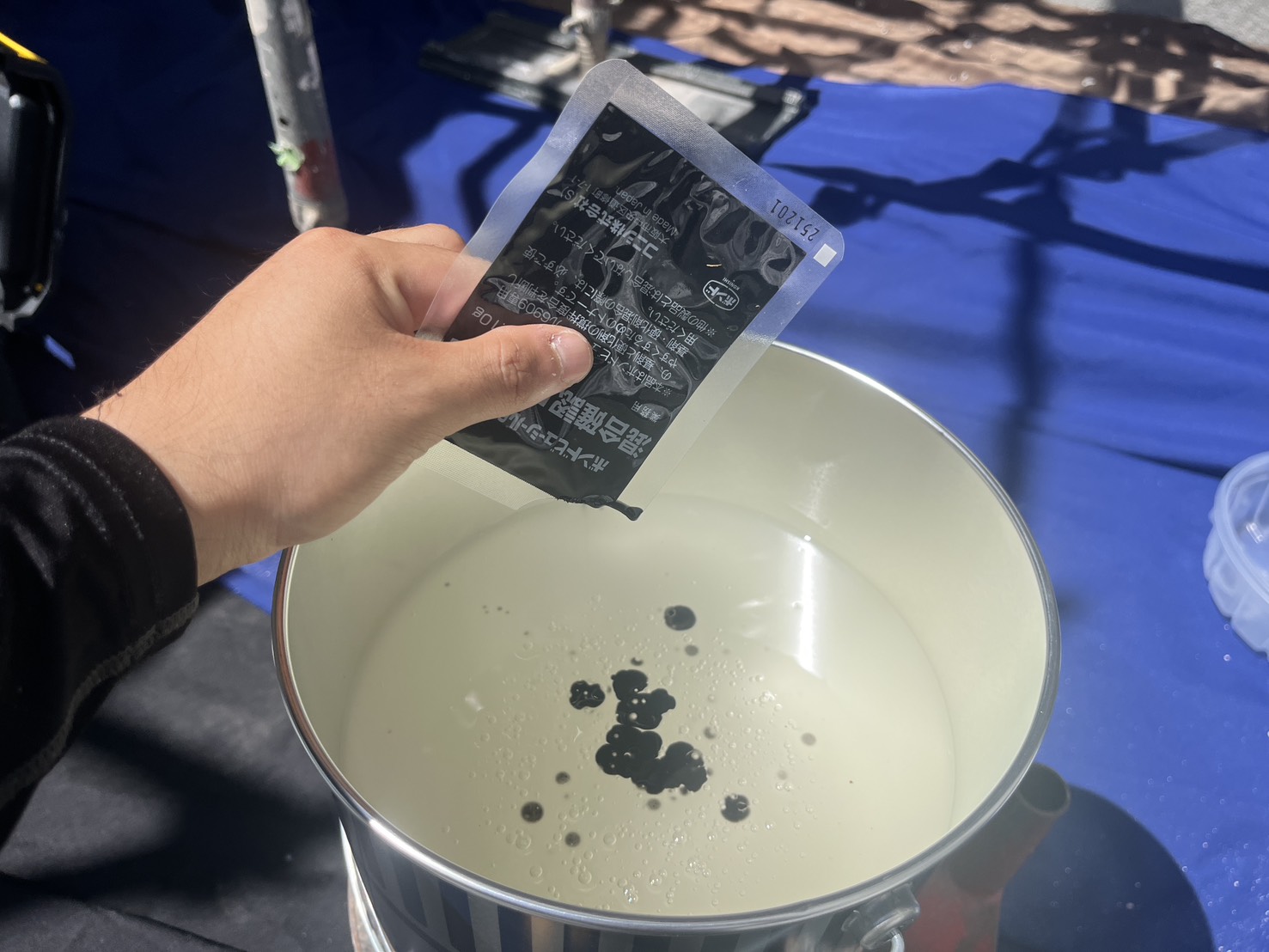 外壁・業務用コーキング材開封後、混合確認用トナー(色粉)の投入です。