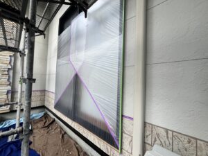 外壁・1F南面側(玄関横)・養生施工です。