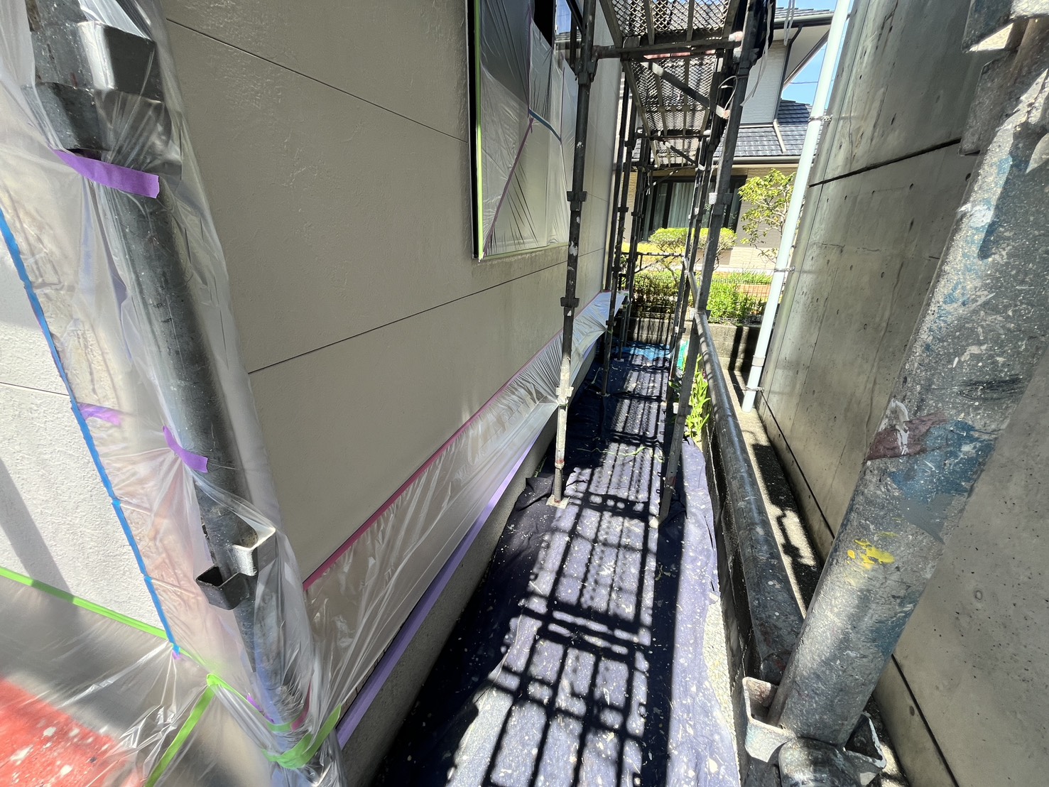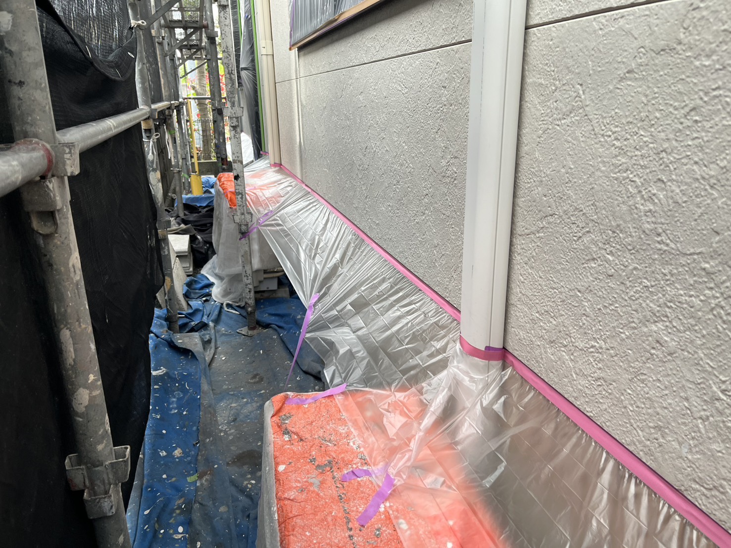 外壁・1F東面側・養生施工です。