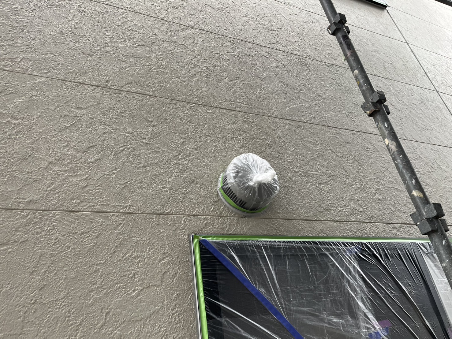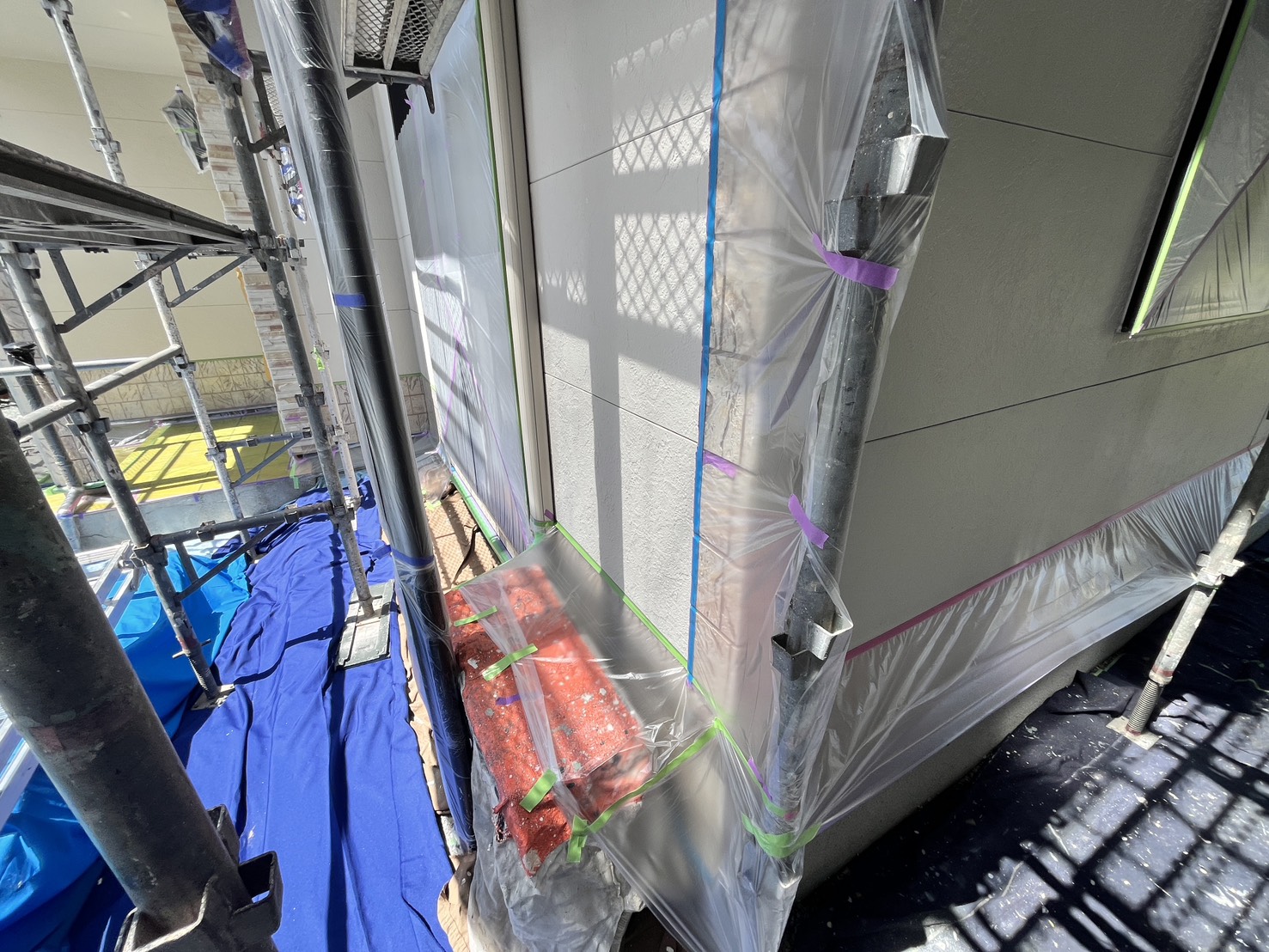 外壁・1F南面側(玄関横)・養生施工です。
