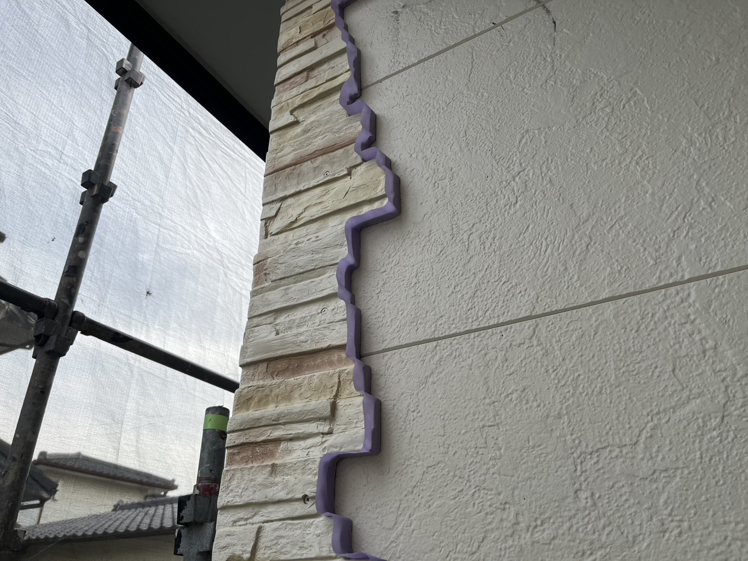 外壁・1F(石面張り・色替え、クリアー部)・養生施工です。
