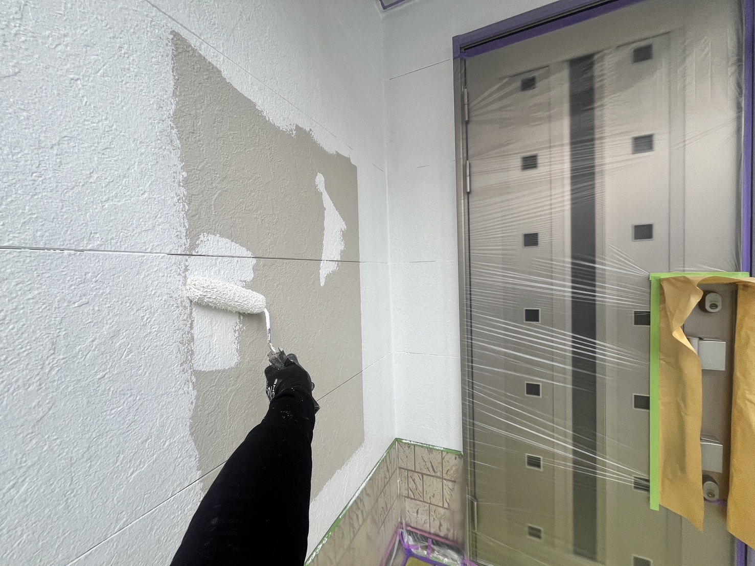 外壁・玄関廻り・水性SDサーフエポプレミアムのローラー塗り施工です。