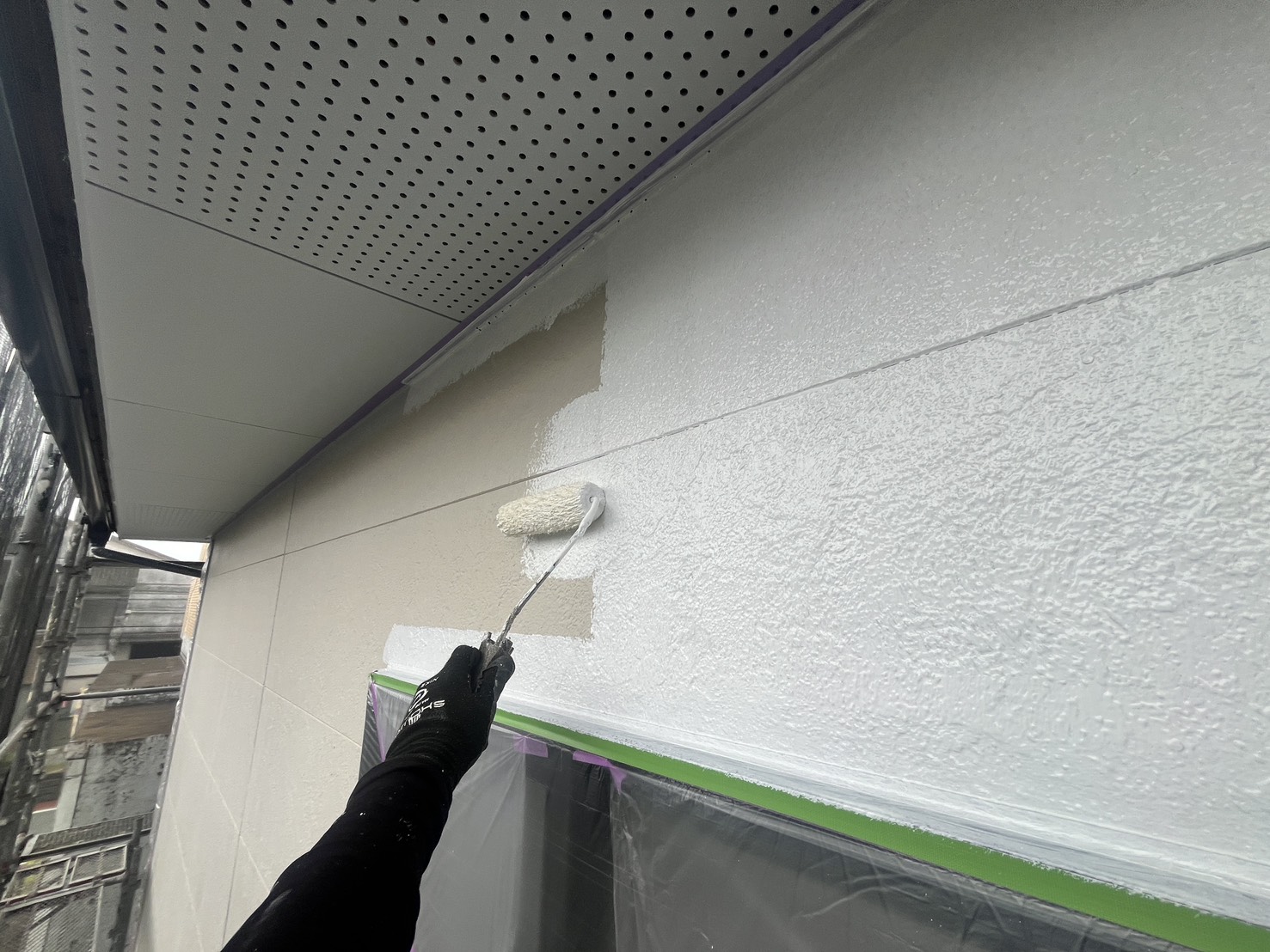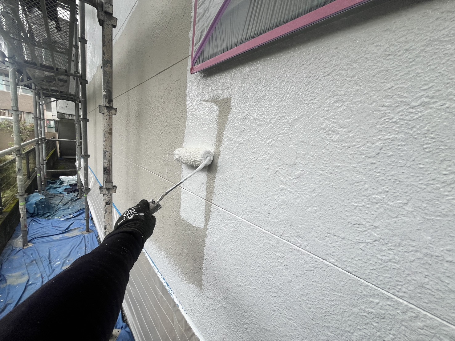 外壁・1F窓廻り・水性SDサーフエポプレミアムのローラー塗り施工です。