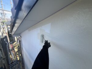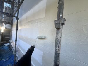 外壁・2F壁面、中塗り:プレミアムシリコン・ラジカル塗料のローラー塗り施工です。