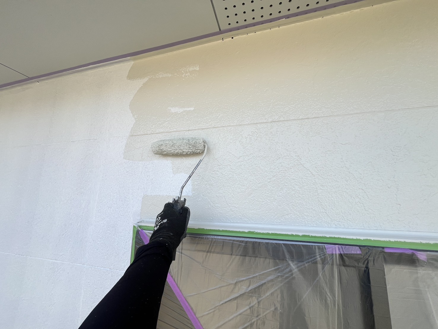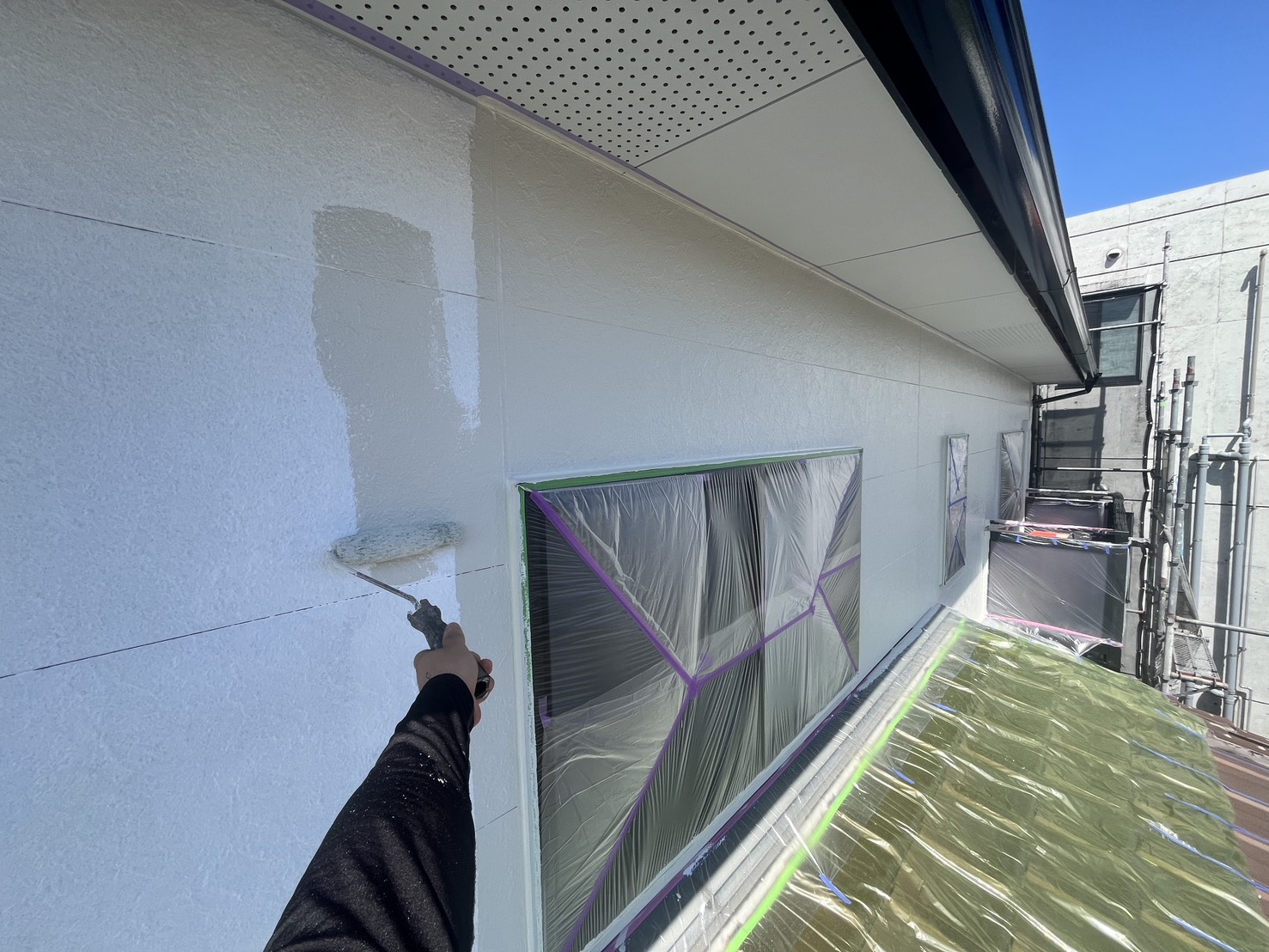 外壁・2F壁面窓廻り、中塗り:プレミアムシリコン・ラジカル塗料のローラー塗り施工です。
