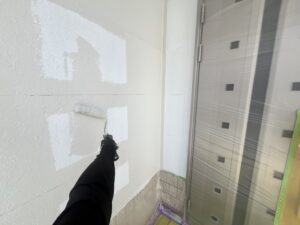 外壁・1F玄関廻り、中塗り:プレミアムシリコン・ラジカル塗料のローラー塗り施工です。