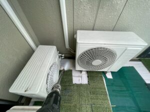 外壁・ベランダ内側・高圧洗浄施工:エアコン室外機・配管・床面の洗浄です。
