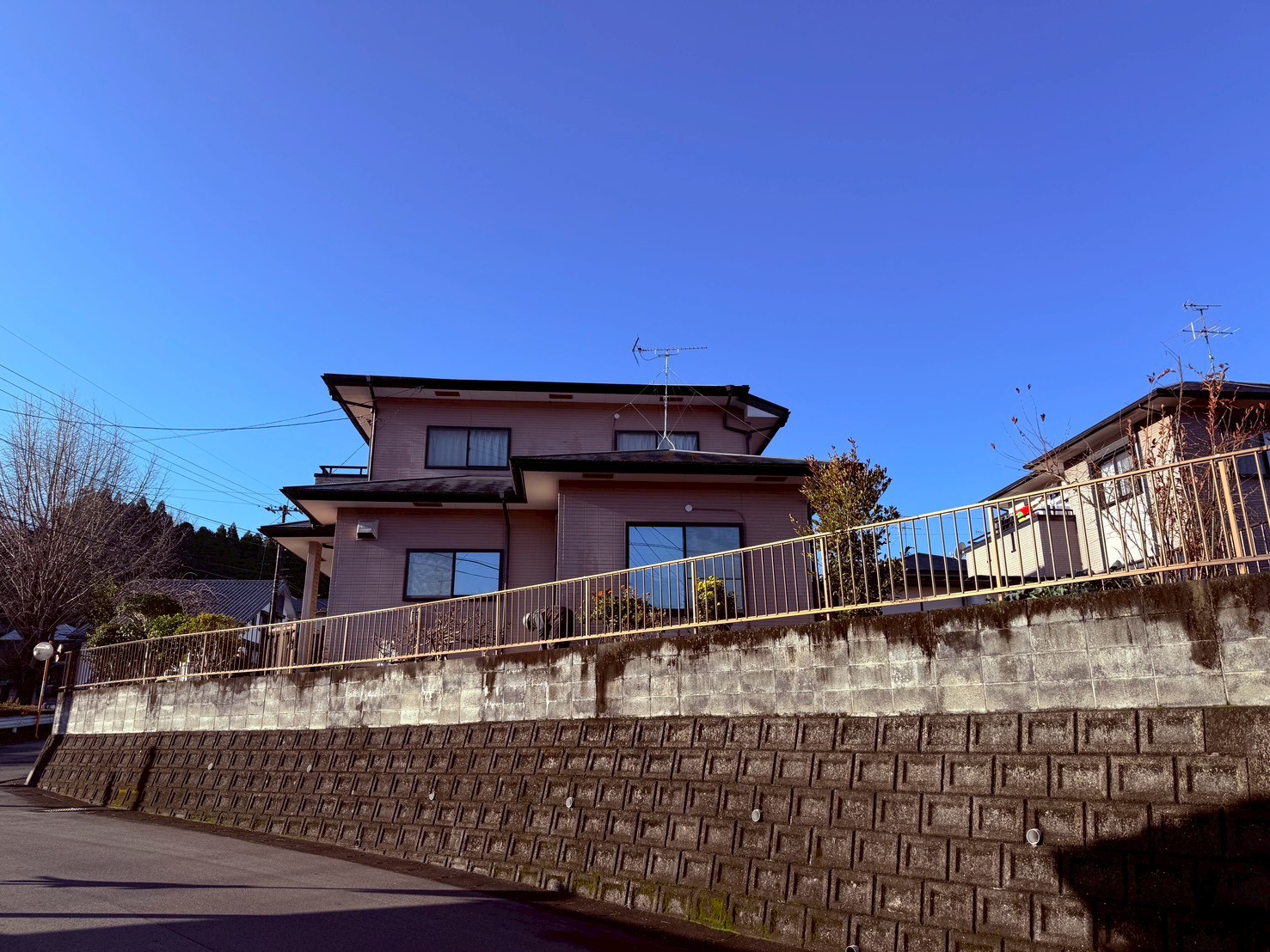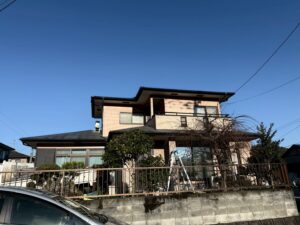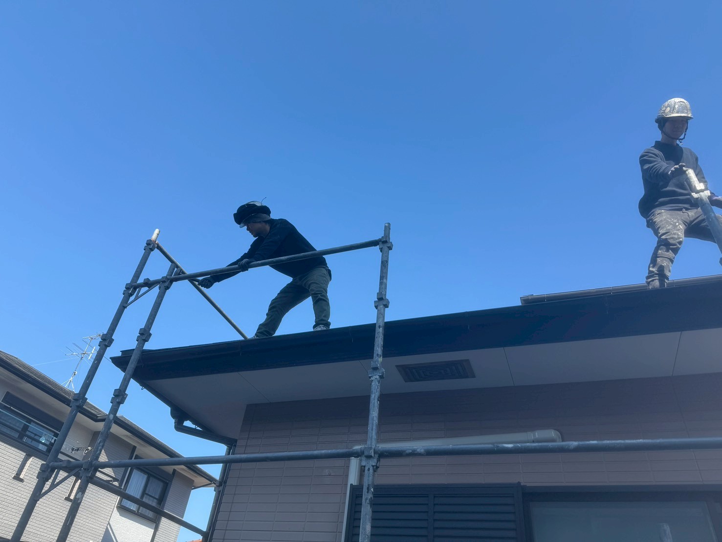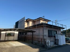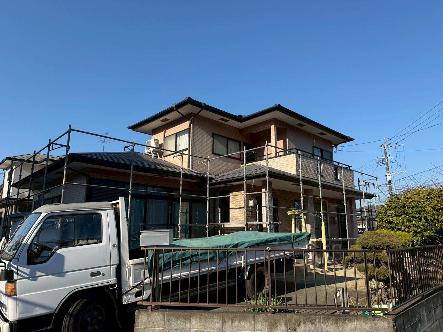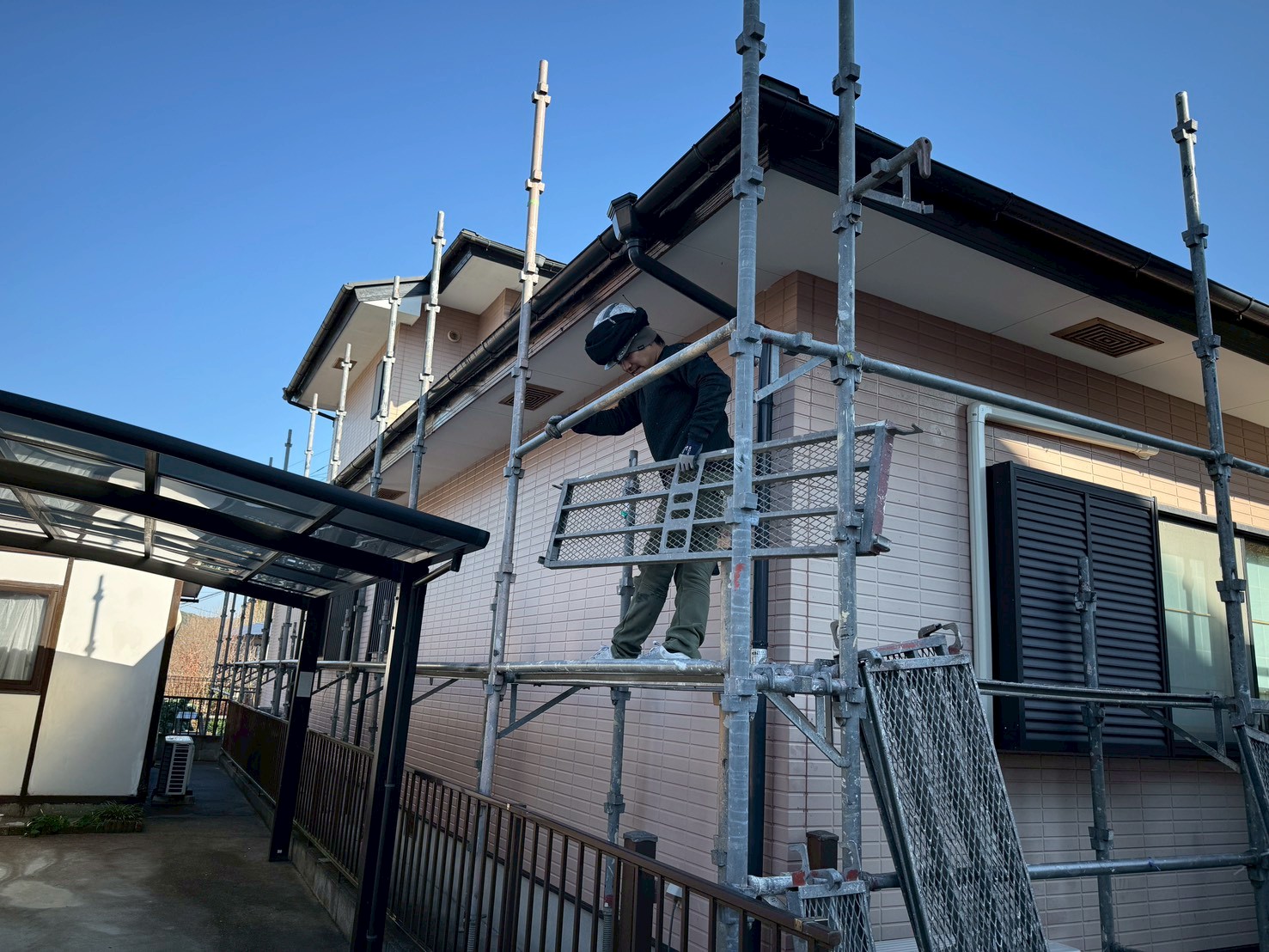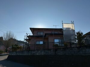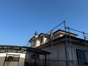 外壁・屋根・架設足場組み上げと飛散防止ネット取り付けの施工:組み上げ完了です。