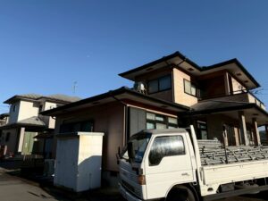 外壁・屋根・架設足場組み上げと飛散防止ネット取り付けの施工:使用部材の運び込みです。
