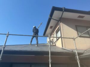 外壁・屋根・架設足場組み上げと飛散防止ネット取り付けの施工:屋根上まで、組み上げを行います。