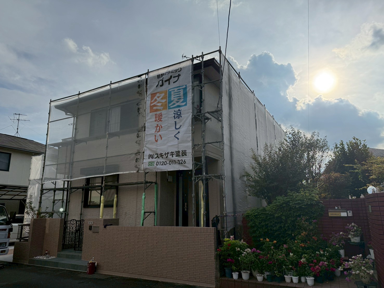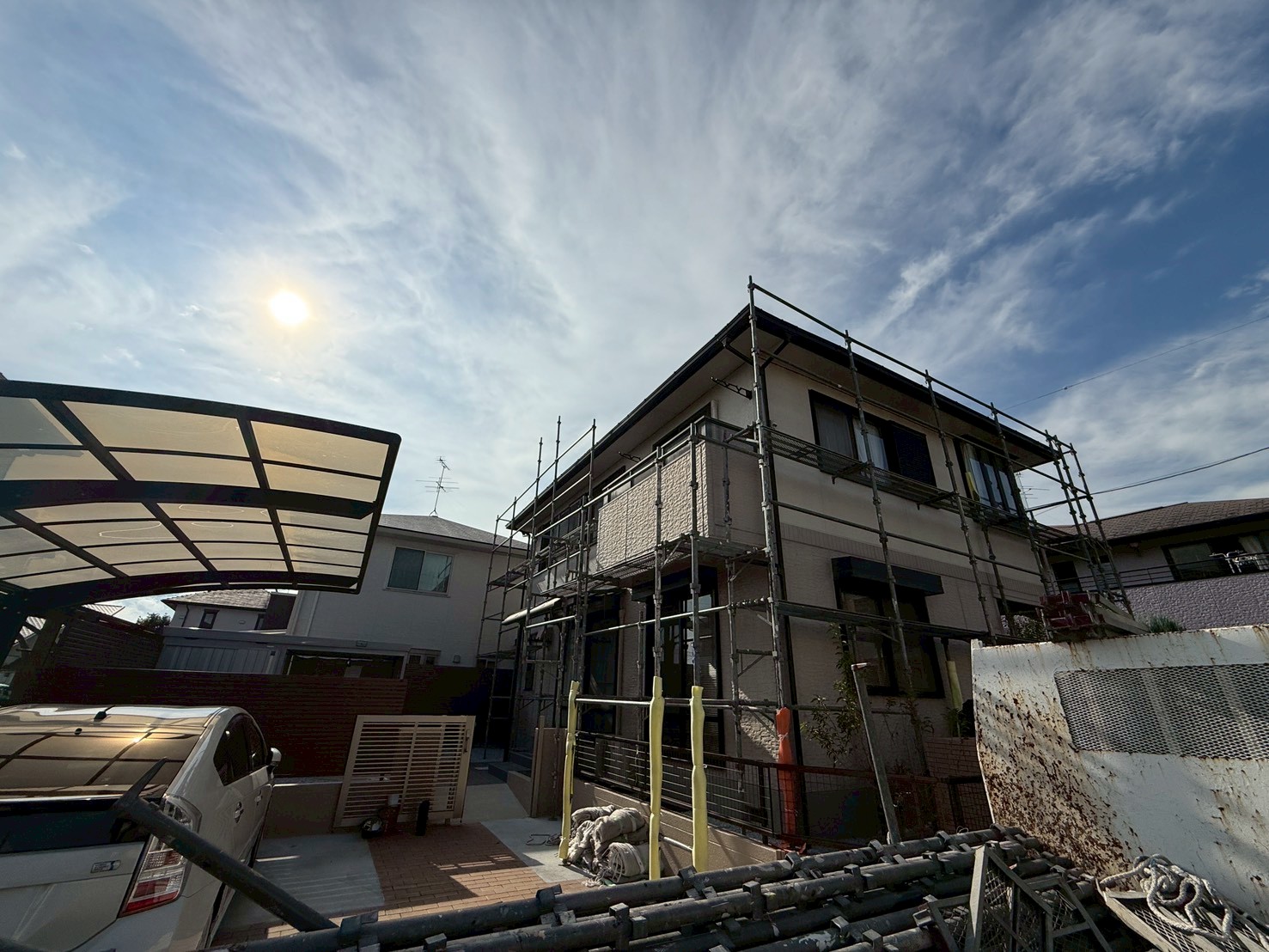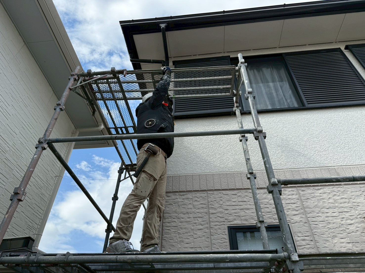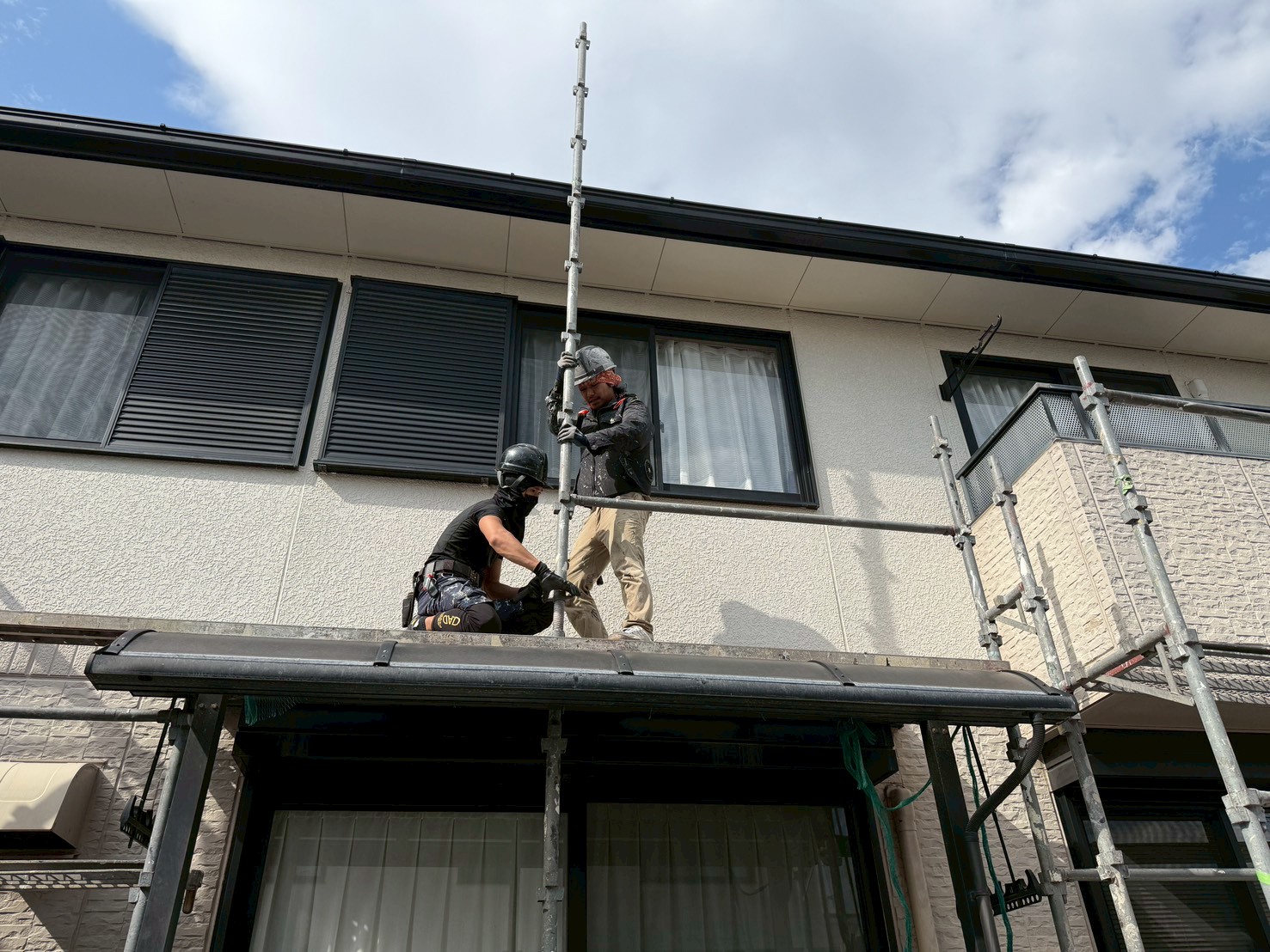 本日の作業は、外壁・下地処理(下塗り)・中塗り:KFスーパーウレアコート施工です。